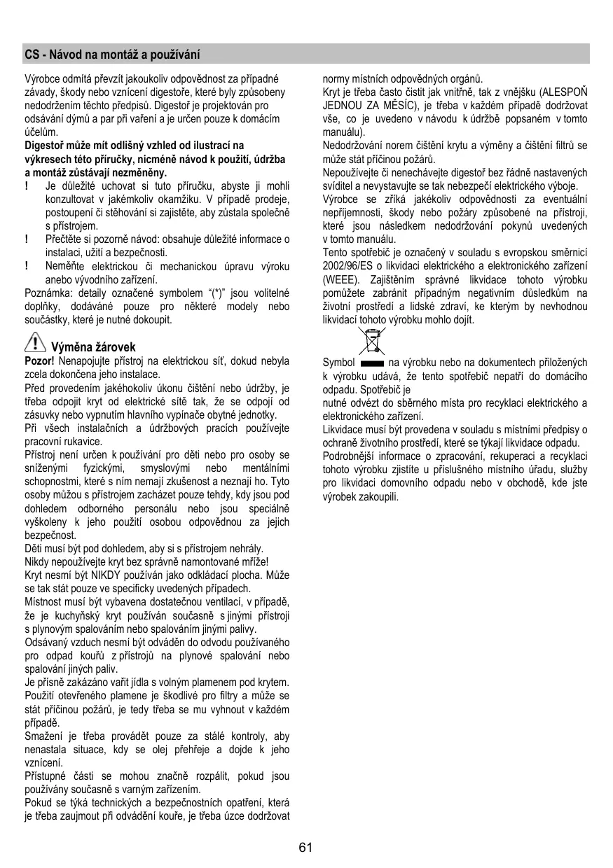 Vyrobce odmistá pržvít jakoukoliv opdovědnost za pripadné závady, skody nebo vznicieni digestoře, ktere byly zpúsobeny nedodržením těchto prědpísu. Digestor je projektován pro odsavány dýmù a par pri vařeni a je určen pouze k domácim učelum.