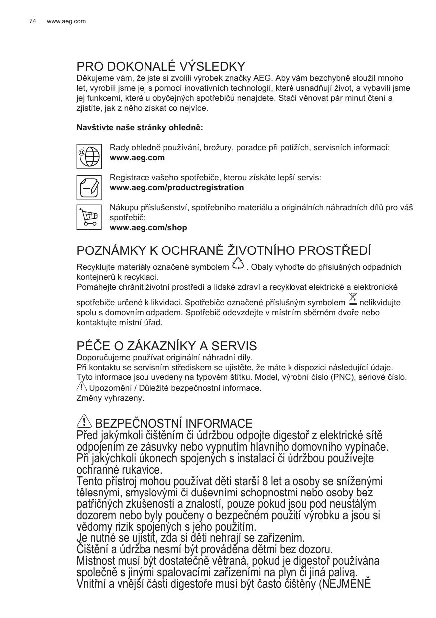 Děkujeme vám, že jste si zvolili výrobek značky AEG. Aby vám bezchybně sloužil mnoho let, vyrobili jsme jej s pomocí inovativních technologií, které usnadňují život, a vybavili jsme jej funkcemi, které u obyčejných spotřebičů nenajdete. Stačí věnovat pár minut čtení a zjistíte, jak z něho získat co nejvíce. Navštivte naše stránky ohledně: Rady ohledně používání, brožury, poradce při potížích, servisních informací: www.aeg.com Registrace vašeho spotřebiče, kterou získáte lepší servis: www.aeg.com/productregistration Nákupu příslušenství, spotřebního materiálu a originálních náhradních dílů pro váš spotřebič: www.aeg.com/shop POZNÁMKY K OCHRANĚ ŽIVOTNÍHO PROSTŘEDÍ Recyklujte materiály označené symbolem . Obaly vyhoďte do příslušných odpadních kontejnerů k recyklaci. Pomáhejte chránit životní prostředí a lidské zdraví a recyklovat elektrické a elektronické spotřebiče určené k likvidaci. Spotřebiče označené příslušným symbolem nelikvidujte spolu s domovním odpadem. Spotřebič odevzdejte v místním sběrném dvoře nebo kontaktujte místní úřad. PÉČE O ZÁKAZNÍKY A SERVIS Doporučujeme používat originální náhradní díly. Při kontaktu se servisním střediskem se ujistěte, že máte k dispozici následující údaje. Tyto informace jsou uvedeny na typovém štítku. Model, výrobní číslo (PNC), sériové číslo. Upozornění / Důležité bezpečnostní informace. Změny vyhrazeny.