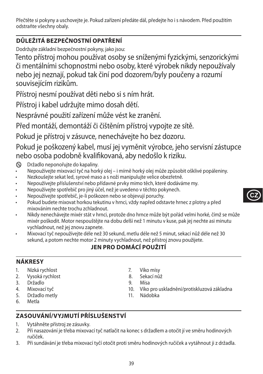 Držadlo neponořujte do kapaliny. Nepoužívejte mixovací tyč na horký olej – i mírně horký olej může způsobit ošklivé popáleniny. Nezkoušejte sekat led, syrové maso a s noži manipulujte velice obezřetně. Nepoužívejte příslušenství nebo přídavné prvky mimo těch, které dodáváme my. Nepoužívejte spotřebič pro jiný účel, než je uvedeno v těchto pokynech. Nepoužívejte spotřebič, je-li poškozen nebo se objevují poruchy. Pokud budete mixovat horkou tekutinu v hrnci, vždy napřed odstavte hrnec z plotny a před mixováním nechte trochu zchladnout. Nikdy nenechávejte mixér stát v hrnci, protože dno hrnce může být pořád velmi horké, čímž se může mixér poškodit. Motor nespouštějte na dobu delší než 1 minutu v kuse, pak jej nechte asi minutu vychladnout, než jej znovu zapnete. Mixovací tyč nepoužívejte déle než 30 sekund, metlu déle než 5 minut, sekací nůž déle než 30 sekund, a potom nechte motor 2 minuty vychladnout, než přístroj znovu použijete.