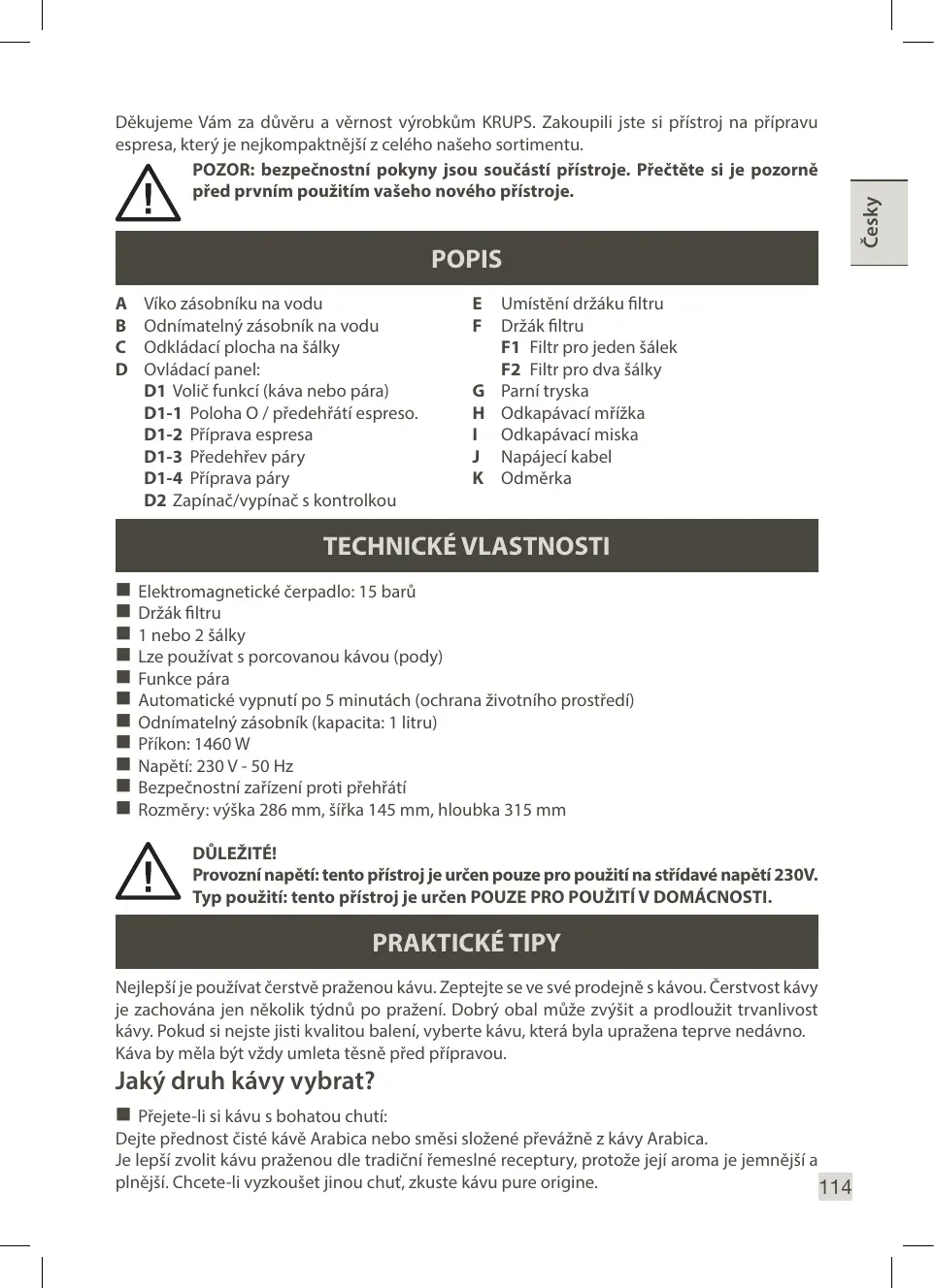 Děkujeme Vám za důvěru a věrnost výrobkům KRUPS. Zakoupili jste si přístroj na přípravu espresa, který je nejkompaktnější z celého našeho sortimentu. POZOR: bezpečnostní pokyny jsou součástí přístroje. Přečtěte si je pozorně před prvním použitím vašeho nového přístroje.