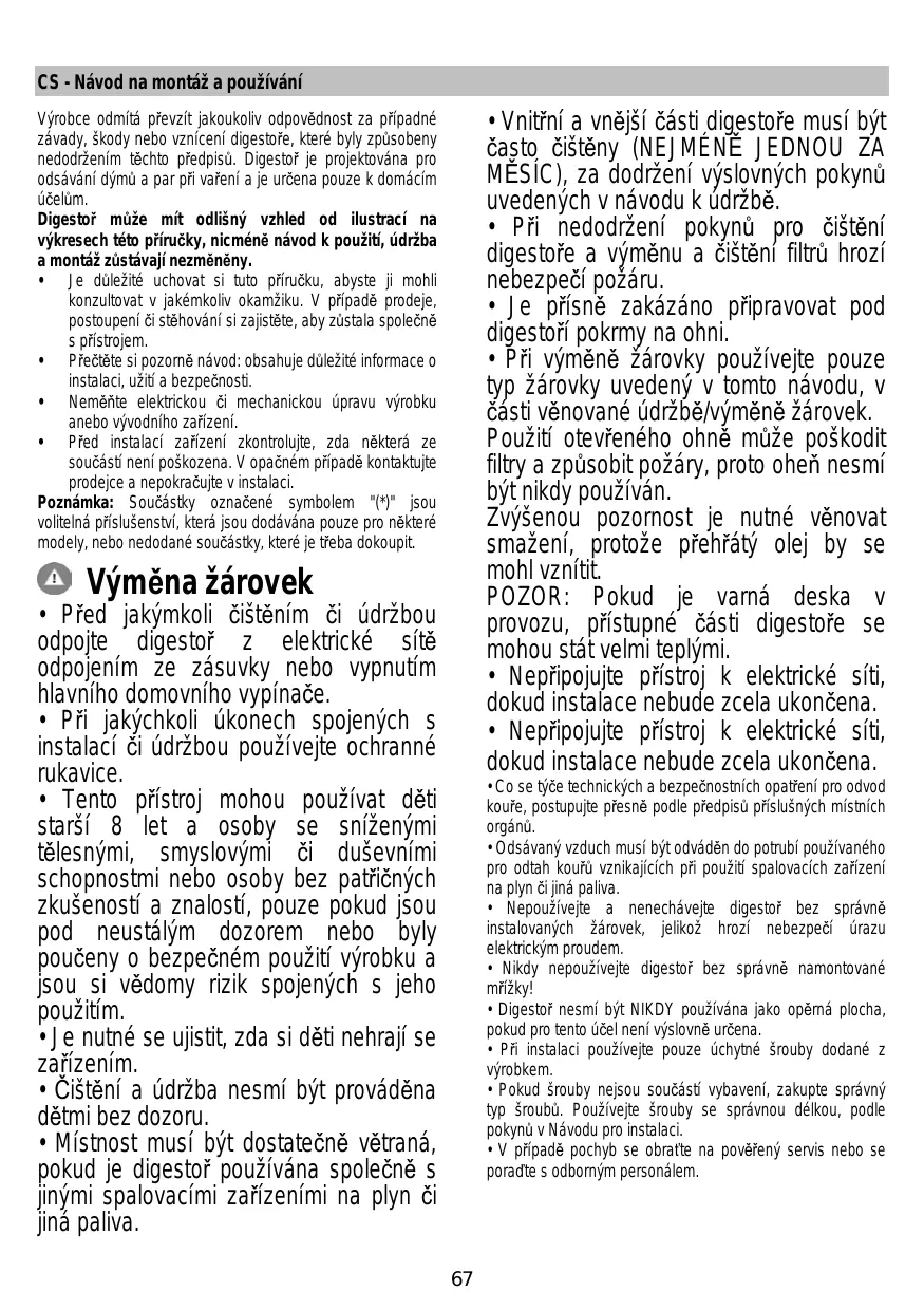 • La hotte doit être régulièrement nettoyée à la fois à l'intérieur et à l'extérieur (AU MOINS UNE FOIS PAR MOIS); cela devrait se faire en conformité avec les instructions d'entretien. Le non respect des instructions expressément fournies concernant le nettoyage de la hotte et des filtres peut provoquer des risques d'incendie. • Ne pas flamber d’aliments sous la hotte. • Pour le remplacement de la lampe, utilisez uniquement le type de lampe spécifié dans la section remplacement/maintenance lampe dans ce manuel. L'utilisation d'une flamme nue est dommageable pour les filtres et peut causer un incendie, par conséquent, il est déconseillé de l'utiliser. La friture doit être faite avec soin afin de s’assurer que l’huile surchauffée ne prenne pas feu. AVERTISSEMENT: Lorsque la table de cuisson est en fonctionnement, les parties accessibles de la hotte peuvent devenir très chaudes. • Ne pas brancher l'appareil au réseau électrique avant que l'installation ne soit complètement terminée.
