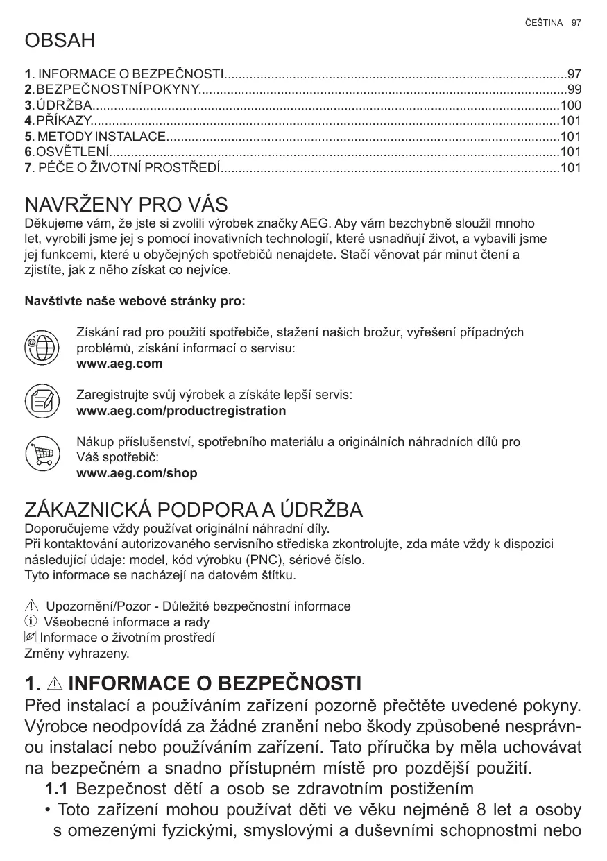 NAVRŽENY PRO VÁS Děkujeme vám, že jste si zvolili výrobek značky AEG. Aby vám bezchybně sloužil mnoho let, vyrobili jsme jej s pomocí inovativních technologií, které usnadňují život, a vybavili jsme jej funkcemi, které u obyčejných spotřebičů nenajdete. Stačí věnovat pár minut čtení a zjistíte, jak z něho získat co nejvíce. Navštivte naše webové stránky pro: Získání rad pro použití spotřebiče, stažení našich brožur, vyřešení případných problémů, získání informací o servisu: www.aeg.com Zaregistrujte svůj výrobek a získáte lepší servis: www.aeg.com/productregistration Nákup příslušenství, spotřebního materiálu a originálních náhradních dílů pro Váš spotřebič: www.aeg.com/shop
