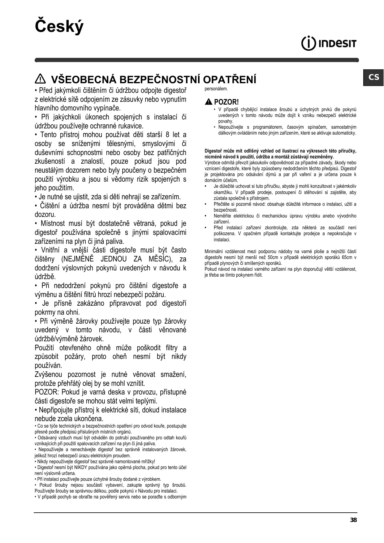 Český VŠEOBECNÁ BEZPEČNOSTNÍ OPATŘENÍ • Před jakýmkoli čištěním či údržbou odpojte digestoř z elektrické sítě odpojením ze zásuvky nebo vypnutím hlavního domovního vypínače. • Při jakýchkoli úkonech spojených s instalací či údržbou používejte ochranné rukavice. • Tento přístroj mohou používat děti starší 8 let a osoby se sníženými tělesnými, smyslovými či duševními schopnostmi nebo osoby bez patřičných zkušeností a znalostí, pouze pokud jsou pod neustálým dozorem nebo byly poučeny o bezpečném použití výrobku a jsou si vědomy rizik spojených s jeho použitím. • Je nutné se ujistit, zda si děti nehrají se zařízením. • Čištění a údržba nesmí být prováděna dětmi bez dozoru. • Místnost musí být dostatečně větraná, pokud je digestoř používána společně s jinými spalovacími zařízeními na plyn či jiná paliva. • Vnitřní a vnější části digestoře musí být často čištěny (NEJMÉNĚ JEDNOU ZA MĚSÍC), za dodržení výslovných pokynů uvedených v návodu k údržbě. • Při nedodržení pokynů pro čištění digestoře a výměnu a čištění filtrů hrozí nebezpečí požáru. • Je přísně zakázáno připravovat pod digestoří pokrmy na ohni. • Při výměně žárovky používejte pouze typ žárovky uvedený v tomto návodu, v části věnované údržbě/výměně žárovek. Použití otevřeného ohně může poškodit filtry a způsobit požáry, proto oheň nesmí být nikdy používán. Zvýšenou pozornost je nutné věnovat smažení, protože přehřátý olej by se mohl vznítit. POZOR: Pokud je varná deska v provozu, přístupné části digestoře se mohou stát velmi teplými. • Nepřipojujte přístroj k elektrické síti, dokud instalace nebude zcela ukončena.