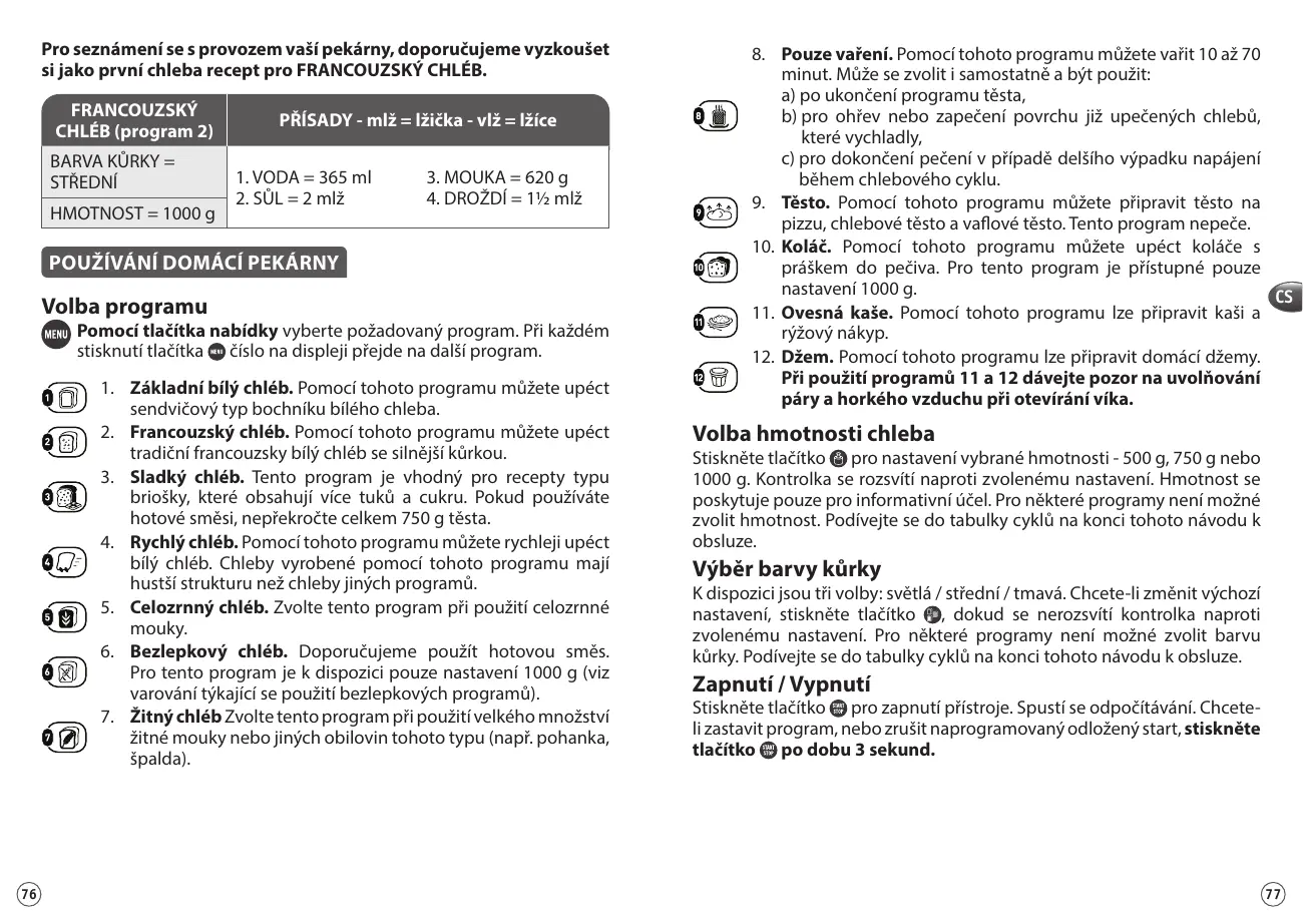 PAIN FRANÇAIS 1. Pain basique. Ce programme permet de réaliser une recette de pain blanc type pain de mie. 2. Pain français. Ce programme permet de réaliser une recette de pain blanc traditionnel français avec une croûte plus épaisse. 3. Pain sucré. Ce programme est adapté aux recettes de type brioche qui contiennent plus de matière grasse et de sucre. Si vous utilisez des préparations prêtes à l’emploi, ne dépassez pas 750 g de pâte au total. 4. Pain rapide. Ce programme permet la réalisation plus rapide de pains blancs. Les pains réalisés avec ce programme ont une texture plus dense que les pains des autres programmes. 5. Pain complet. Ce programme est à sélectionner lorsqu’on utilise de la farine complète. 6. Pain sans gluten. L’utilisation d’un mélange prêt à l’emploi est recommandée. Seul le réglage 1000 g est accessible pour ce programme (voir avertissements pour l’utilisation des programmes sans gluten). 7. Pain au seigle. Ce programme est à sélectionner lorsqu’on utilise une grande quantité de farine de seigle ou d’autres céréales de ce type (ex. sarrasin, épeautre). 8. Cuisson seule. Ce programme permet de cuire de 10 min à 70 min. Il peut être sélectionné seul et être utilisé : a) après le programme Pâtes levées, b) pour réchauffer ou rendre croustillants des pains déjà cuits et refroidis, c) pour finir une cuisson en cas de panne de courant prolongée pendant un cycle de pain. 9. Pâtes Levées. Ce programme permet la réalisation de recettes type pâte à pizza, pâte à pain et pâte à gaufre liégoise. Ce programme ne cuit pas. 10. Gâteau. Permet la confection de gâteaux avec de la levure chimique. Seul le réglage 750 g est accessible pour ce programme.