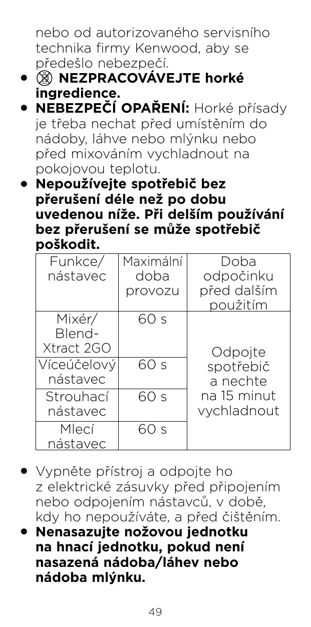 nebo od autorizovaného servisního technika firmy Kenwood, aby se předešlo nebezpečí. NEZPRACOVÁVEJTE horké ingredience. NEBEZPEČÍ OPAŘENÍ: Horké přísady je třeba nechat před umístěním do nádoby, láhve nebo mlýnku nebo před mixováním vychladnout na pokojovou teplotu. Nepoužívejte spotřebič bez přerušení déle než po dobu uvedenou níže. Při delším používání bez přerušení se může spotřebič poškodit. Doba Funkce/ Maximální doba odpočinku nástavec provozu před dalším použitím 60 s Mixér/ BlendXtract 2GO Odpojte Víceúčelový 60 s spotřebič nástavec a nechte na 15 minut Strouhací 60 s vychladnout nástavec Mlecí 60 s nástavec Vypněte přístroj a odpojte ho z elektrické zásuvky před připojením nebo odpojením nástavců, v době, kdy ho nepoužíváte, a před čištěním. Nenasazujte nožovou jednotku na hnací jednotku, pokud není nasazená nádoba/láhev nebo nádoba mlýnku. 49