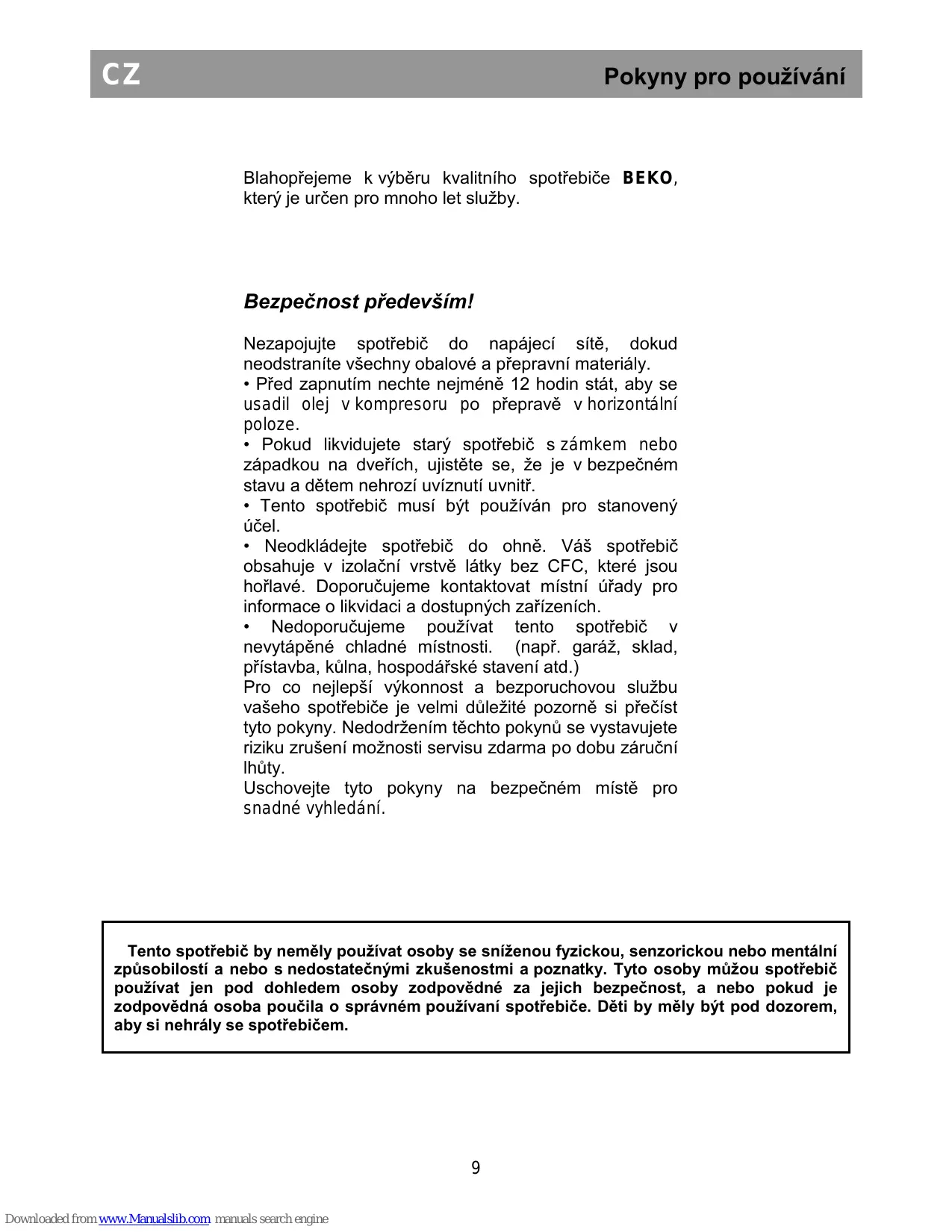 Blahopřejeme k výběru kvalitního spotřebiče BEKO, který je určen pro mnoho let služby. Bezpečnost především! Nezapojujte spotřebič do napájecí sítě, dokud neodstraníte všechny obalové a přepravní materiály.