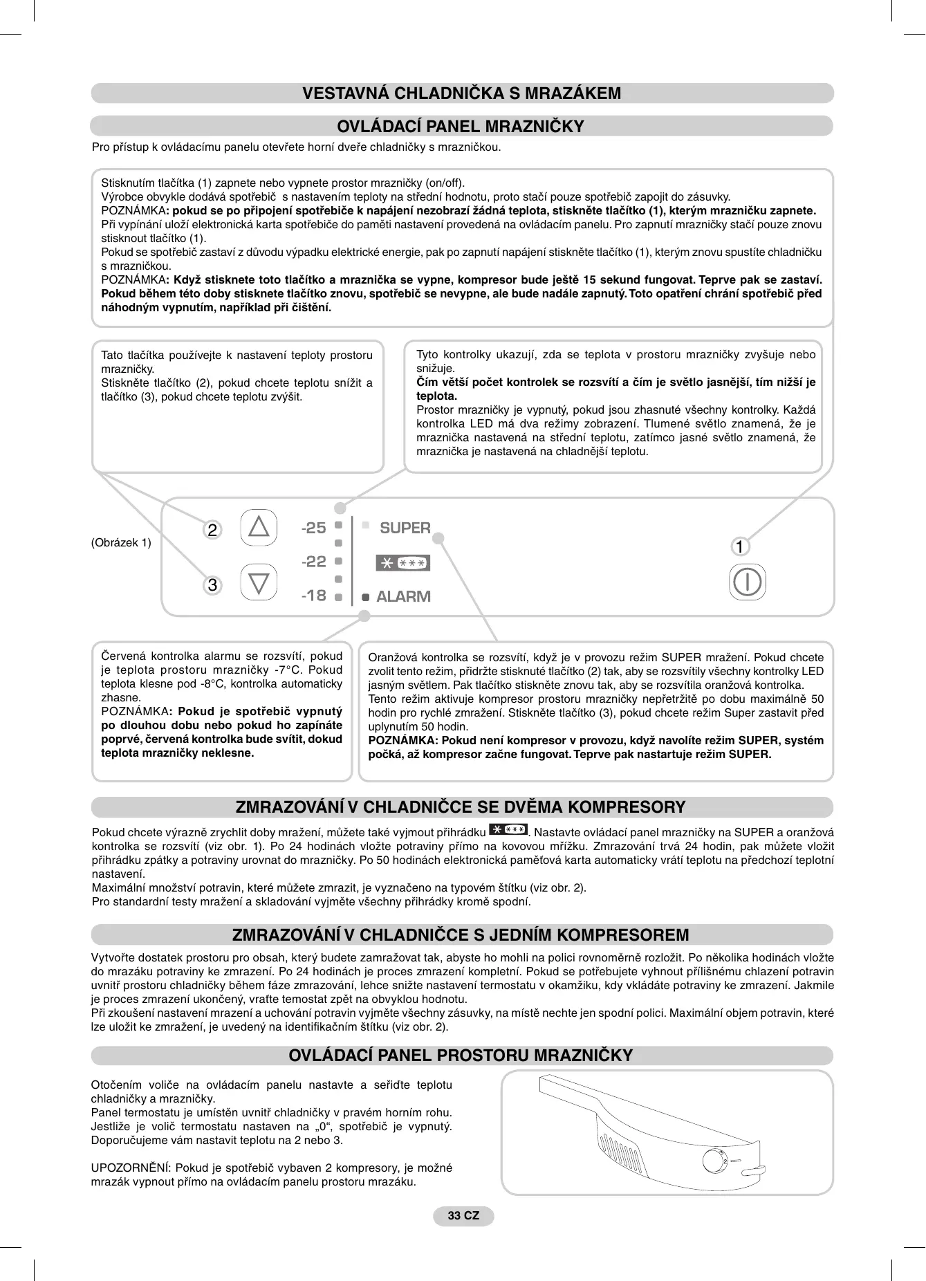 1 Le témoin orange s‘allume en cas d‘activation de la fonction SUPER. Pour activer cette fonction, appuyez plusieurs fois sur la touche (2) de sorte que tous les LED aient une forte intensité lumineuse, puis appuyez à nouveau sur la touche jusqu‘à ce que le témoin orange s‘allume. Cette fonction alimente le compresseur du freezer en continu pendant une durée maximale de 50 heures. Elle est indiquée pour congeler rapidement les aliments. Pour désactiver la fonction SUPER avant que les 50 heures ne soient écoulées, il suffit d’appuyer sur la touche (3). ATTENTION: si le compresseur est en pause à l‘activation de la fonction SUPER, le système attendra que le compresseur redémarre avant d’activer ce mode.