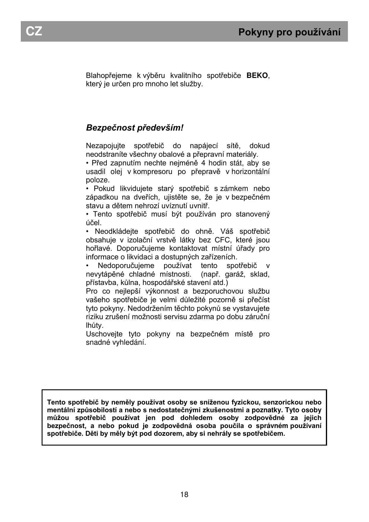 Tento spotbrebič by neměly používat osoby se sníženou fyzickou, senzorickou nebo mentalní způsobilostí a nebo s nedostatečnými zkušenostmi a poznatky. Tyto osoby mužou spotbrebič používat Jen pod dohledem osoby zodpovědné za jejich bezpečnost, a nebo pokud je zodpovědná osoba poučila o správném používaní spotbrebiče. Děti by měly být pod dozorem, aby si nehrály se spotbrebičem.