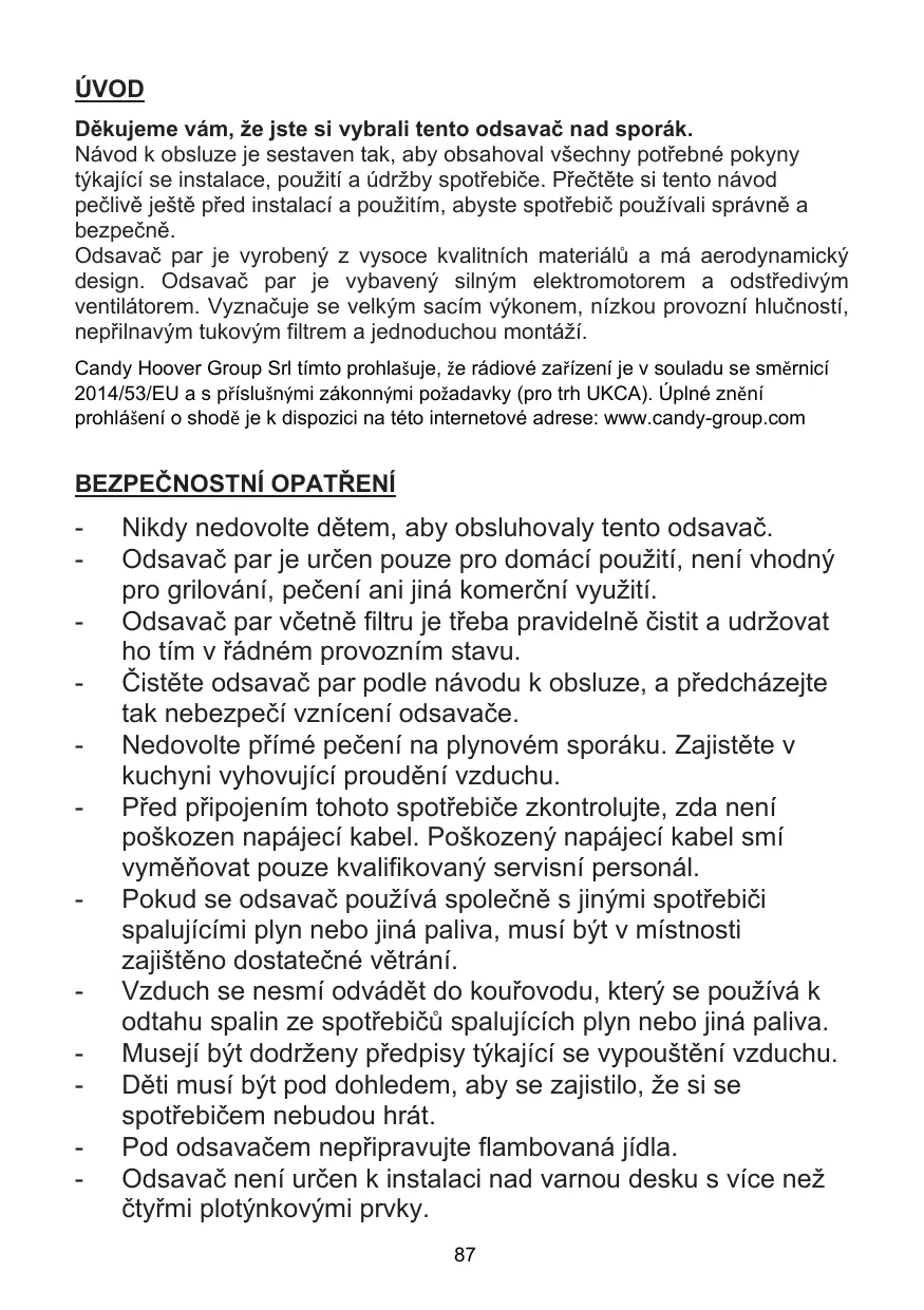 ÚVOD Děkujeme vám, že jste si vybrali tento odsavač nad sporák. Návod k obsluze je sestaven tak, aby obsahoval všechny potřebné pokyny týkající se instalace, použití a údržby spotřebiče. Přečtěte si tento návod pečlivě ještě před instalací a použitím, abyste spotřebič používali správně a bezpečně. Odsavač par je vyrobený z vysoce kvalitních materiálů a má aerodynamický design. Odsavač par je vybavený silným elektromotorem a odstředivým ventilátorem. Vyznačuje se velkým sacím výkonem, nízkou provozní hlučností, nepřilnavým tukovým filtrem a jednoduchou montáží. Candy Hoover Group Srl tímto prohlašuje, že rádiové zařízení je v Candy Hoover Group Srl tímto prohlašuje, že rádiové zařízení je v souladu se směrnicí souladu se směrnicí 2014/53/EU. 2014/53/EU a s příslušnými zákonnými požadavky (pro trh UKCA). Úplné znění Úplné znění EU prohlášení o shodě je k dispozici na tétointernetové prohlášení o shodě je k dispozici na této internetové adrese: www.candy-group.com adrese: www.candy-group.com