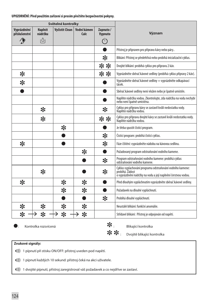 Vider le collecteur de marc (un cycle de 2 cafés est en cours). Vider le collecteur de marc + vider le bac récoltegouttes. Le collecteur de marc est absent ou mal positionné. Remplir le réservoir d'eau. Le réservoir d'eau est absent ou mal positionné. Le cycle café a été interrompu par manque d'eau. Remplir le réservoir d'eau. Le cycle double café a été interrompu par manque d'eau. Remplir le réservoir. Programme de nettoyage demandé. Programme de nettoyage : cycle de nettoyage en cours. Phase de nettoyage : vider le bac à marc. Programme de détartrage demandé. Programme de détartrage : cycle de détartrage en cours. Cycles de rinçage du programme de détartrage : en cours. Demande de vider et de remplir le réservoir d'eau. Vider le bac à cake avant le lancement d'un rinçage long. Demande rinçage long. Rinçage long en cours. Clignotement Simultané : anomalie de fonctionnement. Clignotement voyant après voyant : mise en hors tension de l'appareil en cours. :