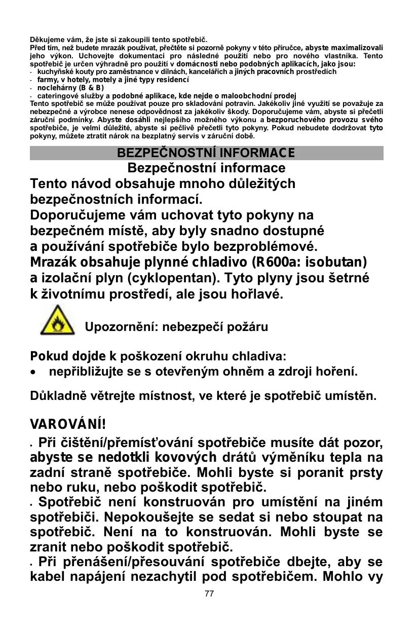 Ce guide contient de nombreuses informations importantes sur la sécurité. Nous vous suggérons de conserver ces instructions dans un endroit sûr pour une référence ultérieure aisée et une bonne utilisation de l’appareil. Ce réfrigérateur contient un gaz réfrigérant (R600a : isobutane) et un gaz isolant (cyclopentane), qui présentent une compatibilité élevée avec l'environnement mais des propriétés inflammables. Attention : risque d'incendie En cas de dommages du circuit de réfrigérant : Éviter des flammes ouvertes et des sources d'inflammation. Bien aérer la pièce dans laquelle se trouve l'appareil. AVERTISSEMENT ! Il convient de prêter une attention particulière lors du nettoyage/du transport de l’appareil pour éviter de toucher les fils métalliques du condenseur à l’arrière de l’appareil, en raison du risque de blessures aux doigts et aux mains et du risque de détérioration de l’appareil. Cet appareil n'est pas conçu pour être empilé avec un autre appareil. Ne pas essayer de s'asseoir ou de se tenir debout sur le dessus de votre appareil étant 58