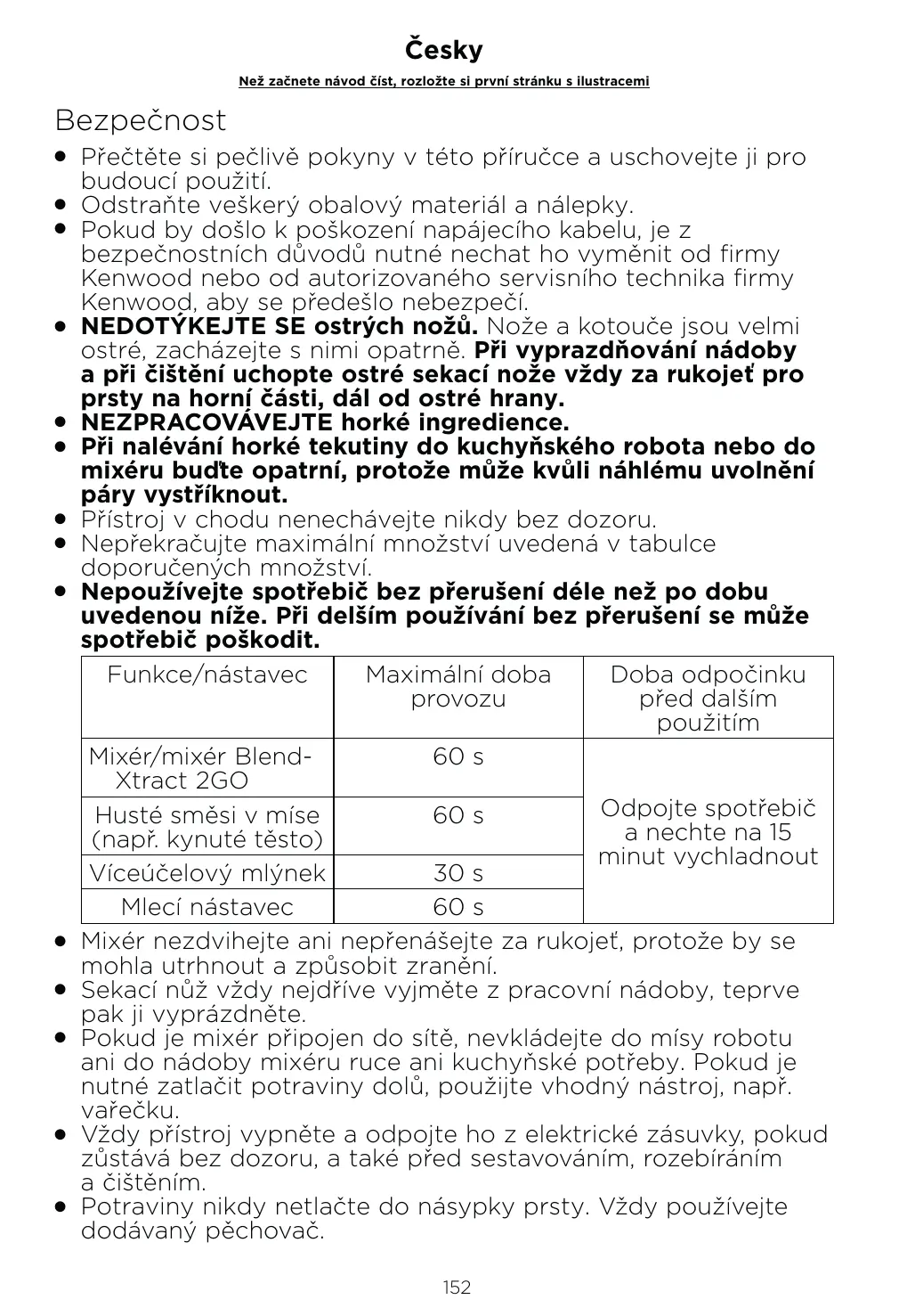 Bezpečnost Přečtěte si pečlivě pokyny v této příručce a uschovejte ji pro budoucí použití. O Odstraňte veškerý obalový materiál a nálepky. O Pokud by došlo k poškození napájecího kabelu, je z bezpečnostních důvodů nutné nechat ho vyměnit od firmy Kenwood nebo od autorizovaného servisního technika firmy Kenwood, aby se předešlo nebezpečí. O NEDOTÝKEJTE SE ostrých nožů. Nože a kotouče jsou velmi ostré, zacházejte s nimi opatrně. Při vyprazdňování nádoby a při čištění uchopte ostré sekací nože vždy za rukojeť pro prsty na horní části, dál od ostré hrany. O NEZPRACOVÁVEJTE horké ingredience. O Při nalévání horké tekutiny do kuchyňského robota nebo do mixéru buďte opatrní, protože může kvůli náhlému uvolnění páry vystříknout. O Přístroj v chodu nenechávejte nikdy bez dozoru. O Nepřekračujte maximální množství uvedená v tabulce doporučených množství. O Nepoužívejte spotřebič bez přerušení déle než po dobu uvedenou níže. Při delším používání bez přerušení se může spotřebič poškodit. Funkce/nástavec Maximální doba Doba odpočinku provozu před dalším použitím Mixér/mixér Blend60 s Xtract 2GO Odpojte spotřebič Husté směsi v míse 60 s a nechte na 15 (např. kynuté těsto) minut vychladnout Víceúčelový mlýnek 30 s Mlecí nástavec 60 s O Mixér nezdvihejte ani nepřenášejte za rukojeť, protože by se mohla utrhnout a způsobit zranění. O Sekací nůž vždy nejdříve vyjměte z pracovní nádoby, teprve pak ji vyprázdněte. O Pokud je mixér připojen do sítě, nevkládejte do mísy robotu ani do nádoby mixéru ruce ani kuchyňské potřeby. Pokud je nutné zatlačit potraviny dolů, použijte vhodný nástroj, např. vařečku. O Vždy přístroj vypněte a odpojte ho z elektrické zásuvky, pokud zůstává bez dozoru, a také před sestavováním, rozebíráním a čištěním. O Potraviny nikdy netlačte do násypky prsty. Vždy používejte dodávaný pěchovač. O