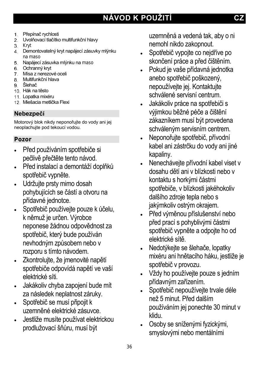 Obturateur amovible pour la prise de courant du hachoir Bouton de déverrouillage du couteau Prise de courant pour le hachoir Couvercle du bol Bol en acier inoxydable Tête multifonction Fouet Crochet pétrisseur éléments mobiles et des orifices destinés à l'insertion des accessoires. Utilisez l'appareil uniquement pour l'usage ménager auquel il est destiné. Le fabricant déclinera toute responsabilité si l'appareil fait l'objet d'une utilisation inappropriée ou si les présentes instructions ne sont pas respectées. Vérifiez que la tension nominale de votre appareil correspond bien à celle de votre réseau électrique. Toute erreur de raccordement annulera la garantie. L'appareil doit être branché à une prise raccordée à la terre.
