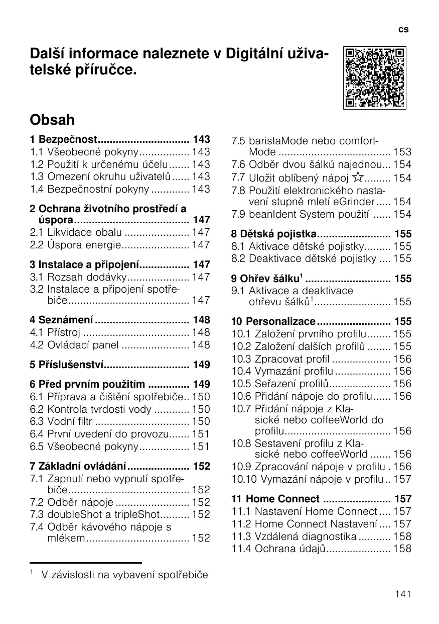 Další informace naleznete v Digitální uživatelské příručce. Obsah 1 Bezpečnost 143 1.1 Všeobecné pokyny 143 1.2 Použití k určenému účelu 143 1.3 Omezení okruhu uživatelů 143 1.4 Bezpečnostní pokyny 143 2 Ochrana životního prostředí a úspora 147 2.1 Likvidace obalu 147 2.2 Úspora energie 147 3 Instalace a připojení 147 3.1 Rozsah dodávky 147 3.2 Instalace a připojení spotřebiče 147 4 Seznámení 148 4.1 Přístroj 148 4.2 Ovládací panel 148 5 Příslušenství 149 6 Před prvním použitím 149 6.1 Příprava a čištění spotřebiče.. 150 6.2 Kontrola tvrdosti vody 150 6.3 Vodní filtr 150 6.4 První uvedení do provozu 151 6.5 Všeobecné pokyny 151 7 Základní ovládání 152 7.1 Zapnutí nebo vypnutí spotřebiče 152 7.2 Odběr nápoje 152 7.3 doubleShot a tripleShot 152 7.4 Odběr kávového nápoje s mlékem 152 1