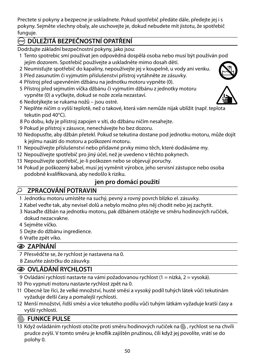 A DŮLEŽITÁ BEZPEČNOSTNÍ OPATŘENÍ Dodržujte základní bezpečnostní pokyny, jako jsou: 1 Tento spotrebic smí používat jen odpovědná dospělá osoba nebo musí být používán pod jejím dozorem. Spotřebič používejte a uskladněte mimo dosah dětí. 2 Neumisťujte spotřebič do kapaliny, nepoužívejte jej v koupelně, u vody ani venku. 3 Před zasunutím či vyjmutím příslušenství přístroj vytáhněte ze zásuvky. 4 Přístroj před upevněním džbánu na jednotku motoru vypněte (0). 5 Přístroj před sejmutím víčka džbánu či vyjmutím džbánu z jednotky motoru vypněte (0) a vyčkejte, dokud se nože zcela nezastaví. 6 Nedotýkejte se rukama nožů – jsou ostré. 7 Neplňte ničím o vyšší teplotě, než o takové, která vám nemůže nijak ublížit (např. teplota tekutin pod 40°C). 8 Po dobu, kdy je přístroj zapojen v síti, do džbánu ničím nesahejte. 9 Pokud je přístroj v zásuvce, nenechávejte ho bez dozoru. 10 Nedopusťte, aby džbán přetekl. Pokud se tekutina dostane pod jednotku motoru, může dojít k jejímu nasátí do motoru a poškození motoru. 11 Nepoužívejte příslušenství nebo přídavné prvky mimo těch, které dodáváme my. 12 Nepoužívejte spotřebič pro jiný účel, než je uvedeno v těchto pokynech. 13 Nepoužívejte spotřebič, je-li poškozen nebo se objevují poruchy. 14 Pokud je poškozený kabel, musí jej vyměnit výrobce, jeho servisní zástupce nebo osoba podobně kvalifikovaná, aby nedošlo k riziku.