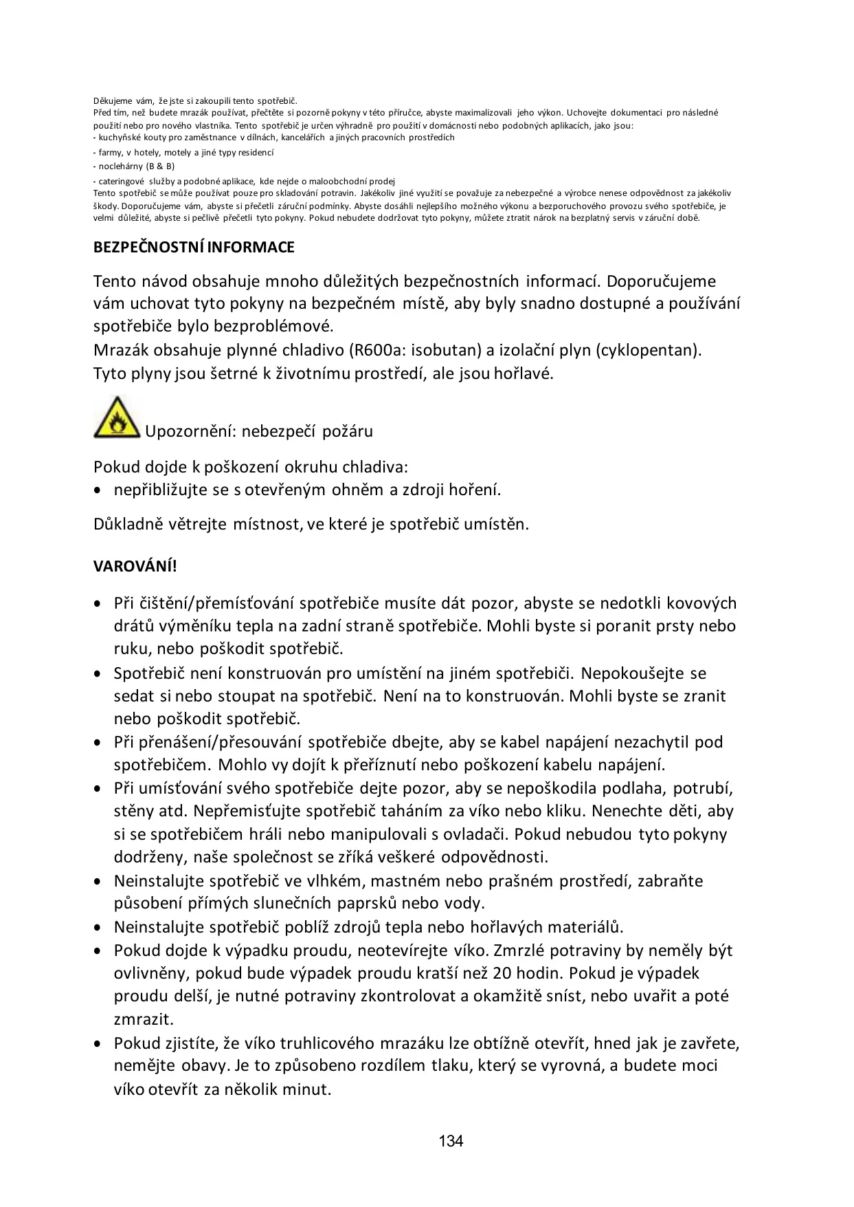BEZPEČNOSTNÍ INFORMACE Tento návod obsahuje mnoho důležitých bezpečnostních informací. Doporučujeme vám uchovat tyto pokyny na bezpečném místě, aby byly snadno dostupné a používání spotřebiče bylo bezproblémové. Mrazák obsahuje plynné chladivo (R600a: isobutan) a izolační plyn (cyklopentan). Tyto plyny jsou šetrné k životnímu prostředí, ale jsou hořlavé. Upozornění: nebezpečí požáru Pokud dojde k poškození okruhu chladiva: • nepřibližujte se s otevřeným ohněm a zdroji hoření. Důkladně větrejte místnost, ve které je spotřebič umístěn. VAROVÁNÍ!