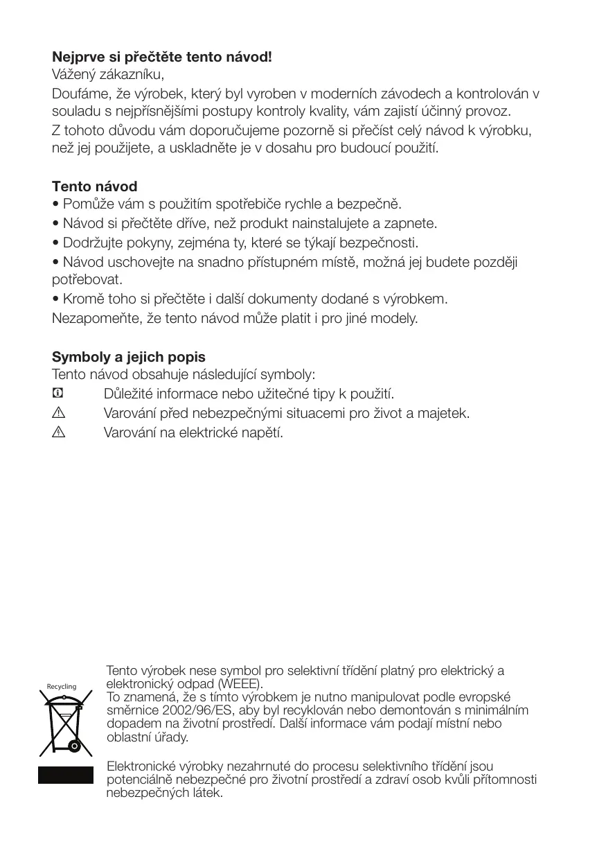 DE Nejprve si přečtěte tento návod! Vážený zákazníku, Doufáme, že výrobek, který byl vyroben v moderních závodech a kontrolován v souladu s nejpřísnějšími postupy kontroly kvality, vám zajistí účinný provoz. Z tohoto důvodu vám doporučujeme pozorně si přečíst celý návod k výrobku, než jej použijete, a uskladněte je v dosahu pro budoucí použití. Tento návod • Pomůže vám s použitím spotřebiče rychle a bezpečně. • Návod si přečtěte dříve, než produkt nainstalujete a zapnete. • Dodržujte pokyny, zejména ty, které se týkají bezpečnosti. • Návod uschovejte na snadno přístupném místě, možná jej budete později potřebovat. • Kromě toho si přečtěte i další dokumenty dodané s výrobkem. Nezapomeňte, že tento návod může platit i pro jiné modely. Symboly a jejich popis Tento návod obsahuje následující symboly: C Důležité informace nebo užitečné tipy k použití. A Varování před nebezpečnými situacemi pro život a majetek. B Varování na elektrické napětí.