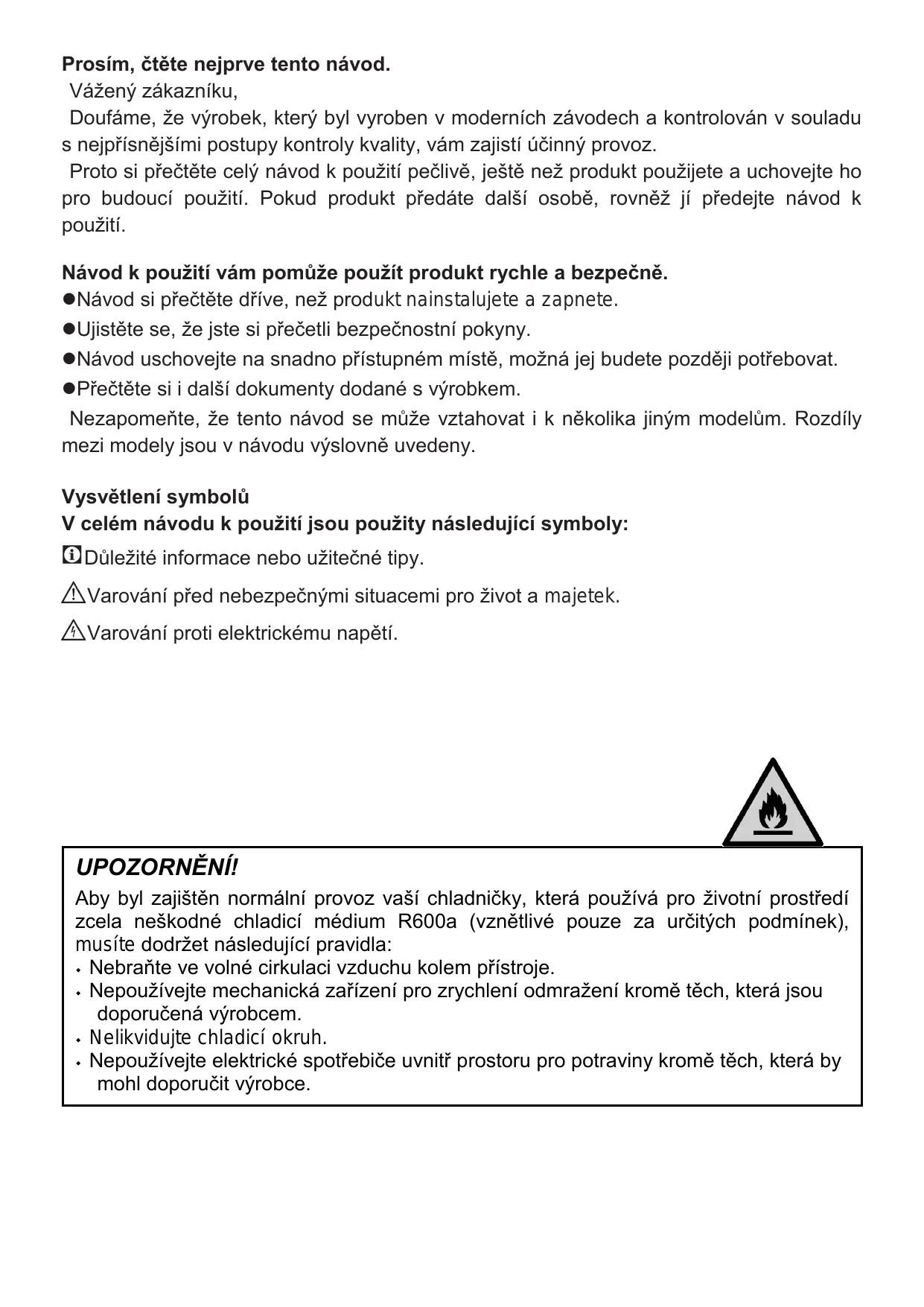 UPOZORNĚNÍ! Aby byl zajištěn normální provoz vaší chladničky, která používá pro životní prostředí zcela neškodné chladicí médium R600a (vznětlivé pouze za určitých podmínek), musíte dodržet následující pravidla: Nebraňte ve volné cirkulaci vzduchu kolem přístroje. Nepoužívejte mechanická zařízení pro zrychlení odmražení kromě těch, která jsou doporučená výrobcem. Nelikvidujte chladicí okruh. Nepoužívejte elektrické spotřebiče uvnitř prostoru pro potraviny kromě těch, která by mohl doporučit výrobce.