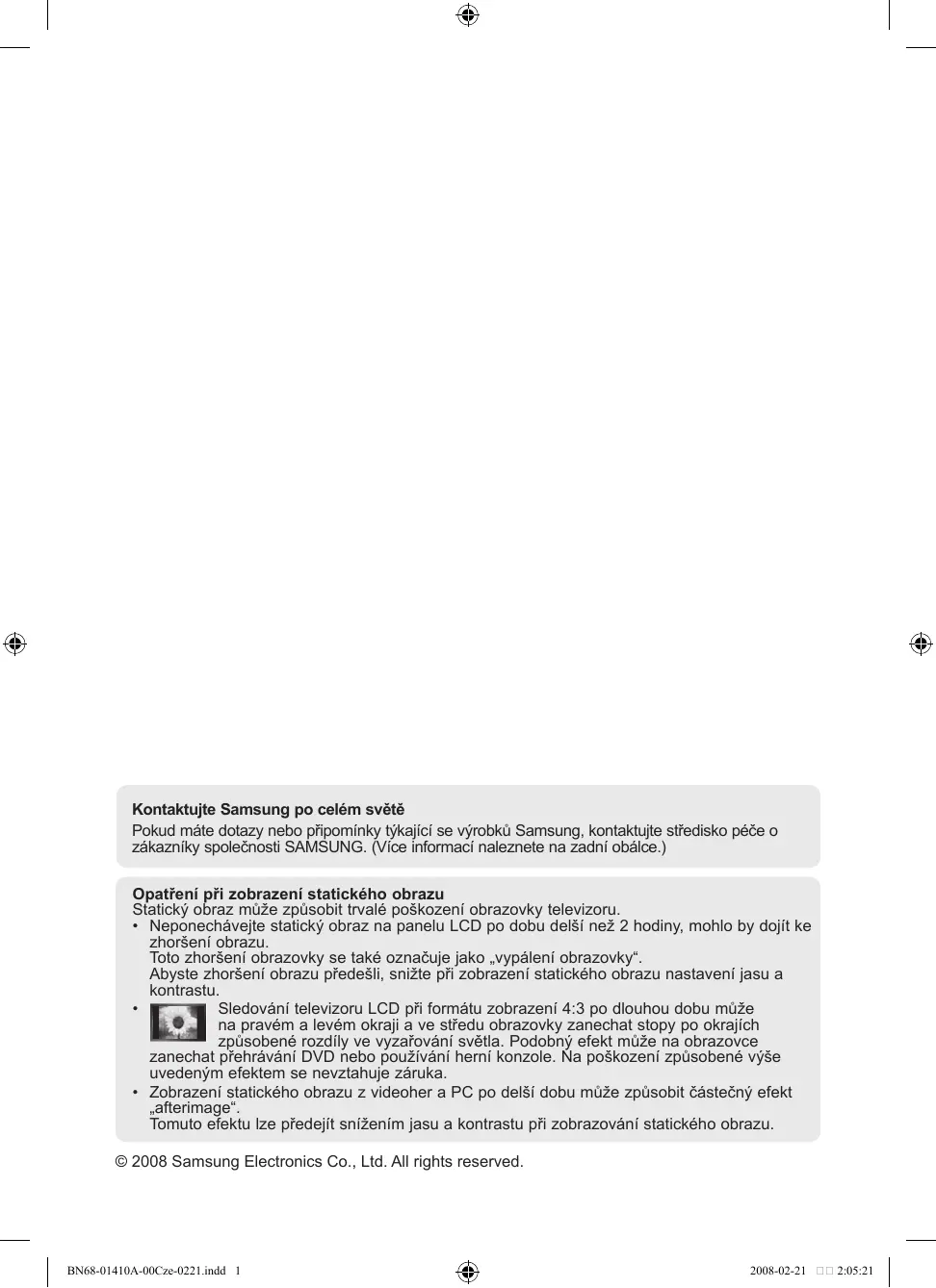 - Zobrazení statického obrazu z videoher a PC po delší dobu může způsobit částečný efekt „afterimage“. Tomuto efektu lze předejít snížením jasu a kontrastu při zobrazování statického obrazu. © 2008 Samsung Electronics Co., Ltd. All rights reserved. BN68-01410A-00Cze-0221.indd 1 2008-02-21 2:05:21 Obsah