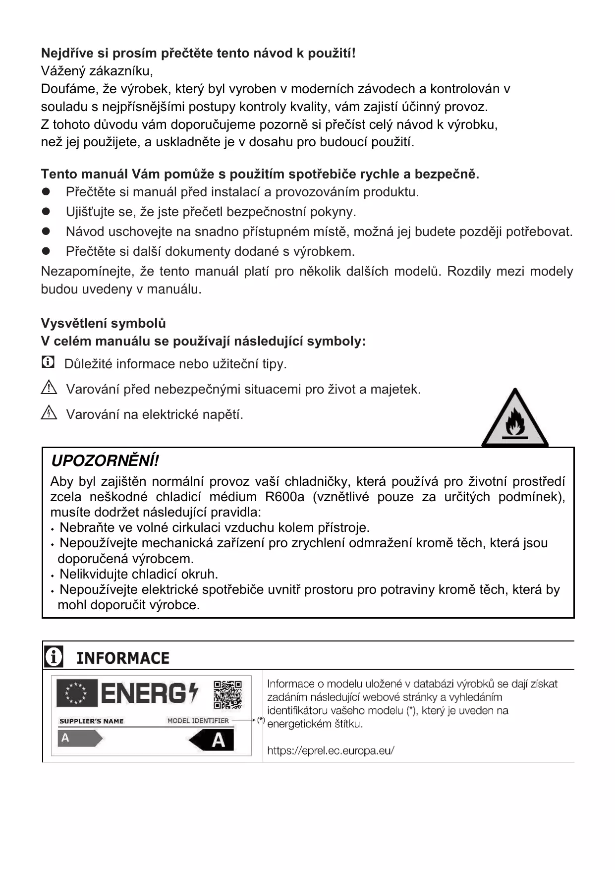 Obsahuje-li Váš chladící systém Vašho spotřebiče R600a: Tento plyn je hořlavý, dávejte pozor nepoškodit chladící systém a systém trubek při použití a přepravě. Pokud dojde k poškození, ochraňte spotřebič před ohněm a větrejte místnost, jde se nachází spotřebič. Druh plynu používaný ve spotřebiči je uvedený na štítku umístěném na levé stěně uvnitř chladničky. Nikdy nevyházejte spotřebič do ohně.