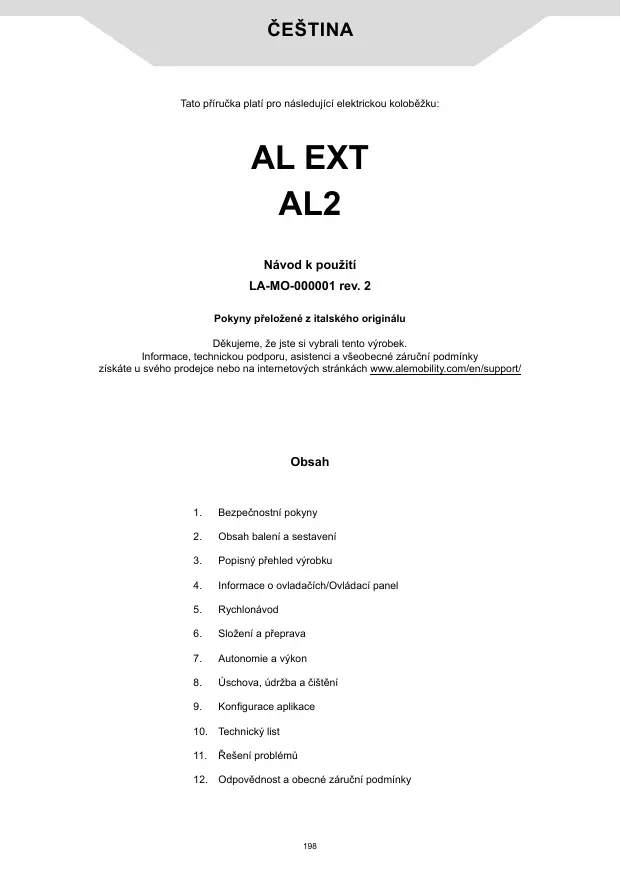 N'utilisez pas d'accessoires et / ou de pièces supplémentaires non approuvés par le fabricant. Tenez les enfants à l'écart des pièces en plastique (y compris les matériaux d'emballage) et des petites pièces qui peuvent provoquer une suffocation. Il est interdit de modifier ou de transformer le produit ou ses parties de quelque manière que ce soit, car cela pourrait nuire à l'efficacité, à la structure et causer des dommages. Si vous détectez des défauts d'usine, des bruits inhabituels ou des anomalies, ne conduisez pas le véhicule et contactez votre concessionnaire ou visitez le site www.alemobility.com/en/ pour bénéficier de l’assistance technique.