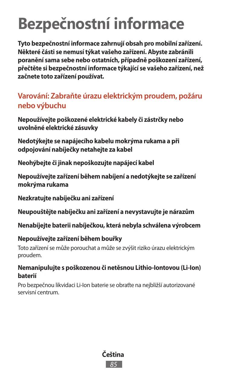 Varování: Zabraňte úrazu elektrickým proudem, požáru nebo výbuchu Nepoužívejte poškozené elektrické kabely či zástrčky nebo uvolněné elektrické zásuvky Nedotýkejte se napájecího kabelu mokrýma rukama a při odpojování nabíječky netahejte za kabel Neohýbejte či jinak nepoškozujte napájecí kabel Nepoužívejte zařízení během nabíjení a nedotýkejte se zařízení mokrýma rukama Nezkratujte nabíječku ani zařízení Neupouštějte nabíječku ani zařízení a nevystavujte je nárazům Nenabíjejte baterii nabíječkou, která nebyla schválena výrobcem Nepoužívejte zařízení během bouřky Toto zařízení se může porouchat a může se zvýšit riziko úrazu elektrickým proudem.