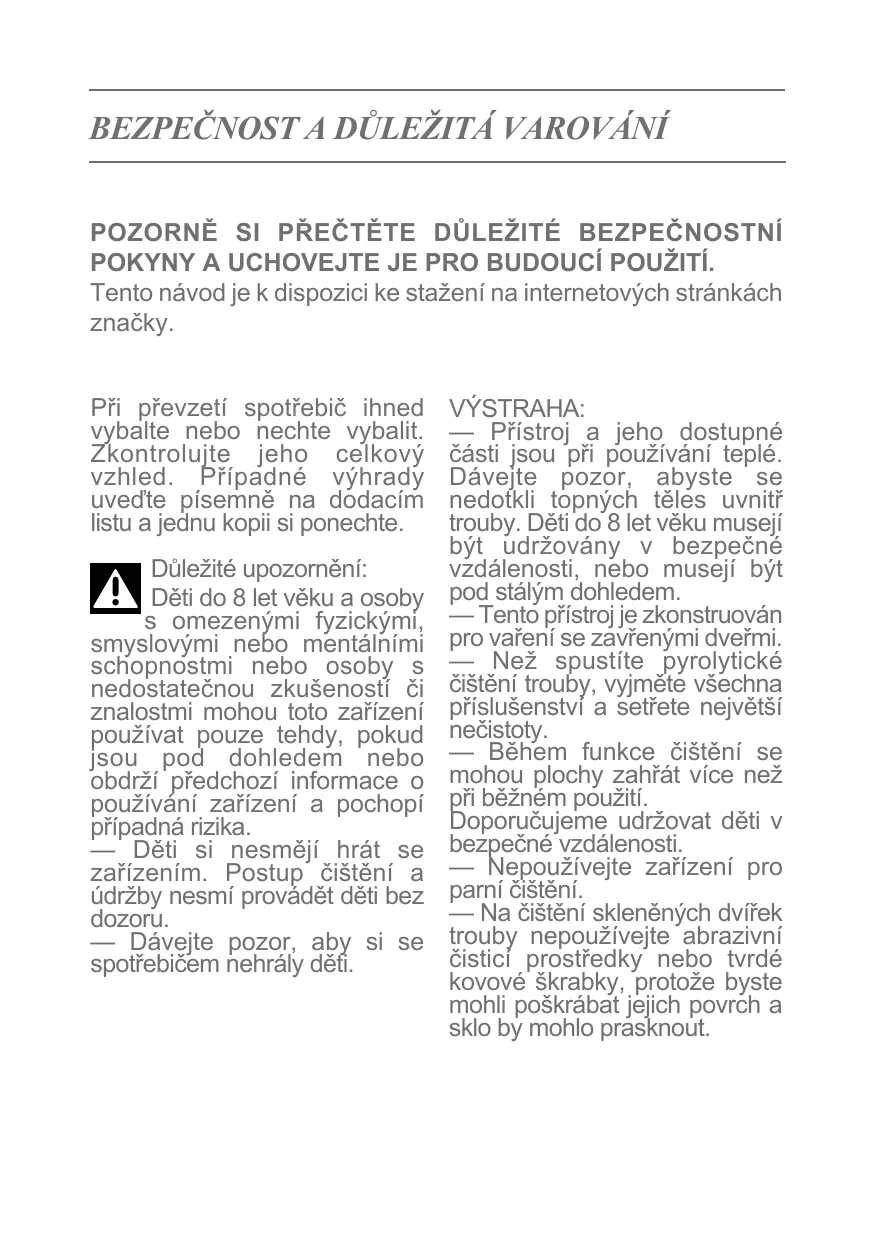VÝSTRAHA: — Přístroj a jeho dostupné části jsou při používání teplé. Dávejte pozor, abyste se nedotkli topných těles uvnitř trouby. Děti do 8 let věku musejí být udržovány v bezpečné vzdálenosti, nebo musejí být pod stálým dohledem. — Tento přístroj je zkonstruován pro vaření se zavřenými dveřmi. — Než spustíte pyrolytické čištění trouby, vyjměte všechna příslušenství a setřete největší nečistoty. — Během funkce čištění se mohou plochy zahřát více než při běžném použití. Doporučujeme udržovat děti v bezpečné vzdálenosti. — Nepoužívejte zařízení pro parní čištění. — Na čištění skleněných dvířek trouby nepoužívejte abrazivní čisticí prostředky nebo tvrdé kovové škrabky, protože byste mohli poškrábat jejich povrch a sklo by mohlo prasknout.