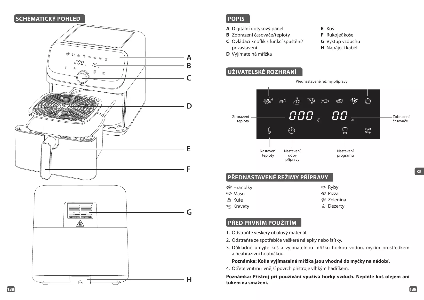2. Limpia el exterior del aparato con un paño húmedo. 3. Limpia la cesta y la rejilla con agua caliente, un poco de líquido lavavajillas y una esponja no abrasiva. Para quitar cualquier resto de suciedad, utiliza un líquido desengrasante. Nota: El cesto y la rejilla extraíble son aptos para el lavavajillas. Sugerencia: Si los restos/residuos de alimentos están pegados en la parte inferior de la cesta y la rejilla, llénalas con agua caliente y un poco de líquido detergente. Deja que la cesta y la rejilla se remojen durante aproximadamente 10 minutos. Luego acláralas, límpialas y sécalas. 4. Limpia el interior del aparato con agua caliente y un paño húmedo. 5. Limpia la resistencia con un cepillo de limpieza seco para eliminar cualquier residuo de alimentos. 6. No sumerjas nunca el aparato en agua ni en ningún otro líquido. et