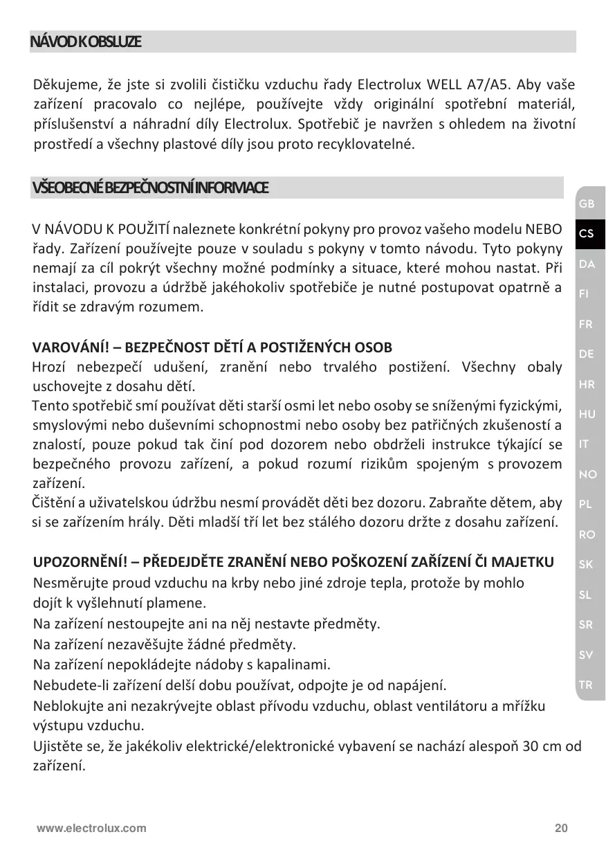 SR Ne montez pas et ne placez pas d’objets sur l’appareil. SV Ne suspendez pas d’objets à l’appareil. Ne placez pas de récipients contenant des liquides sur l’appareil. TR Éteignez l’appareil à la source d’alimentation lorsqu’il n’est pas utilisé pendant une période prolongée. Ne bloquez pas ou ne recouvrez pas la zone d’entrée d’air, la zone du ventilateur et la grille de sortie d’air. Assurez-vous que tout équipement électrique/électronique se trouve à au moins 30 cm de l’appareil. www.electrolux.com