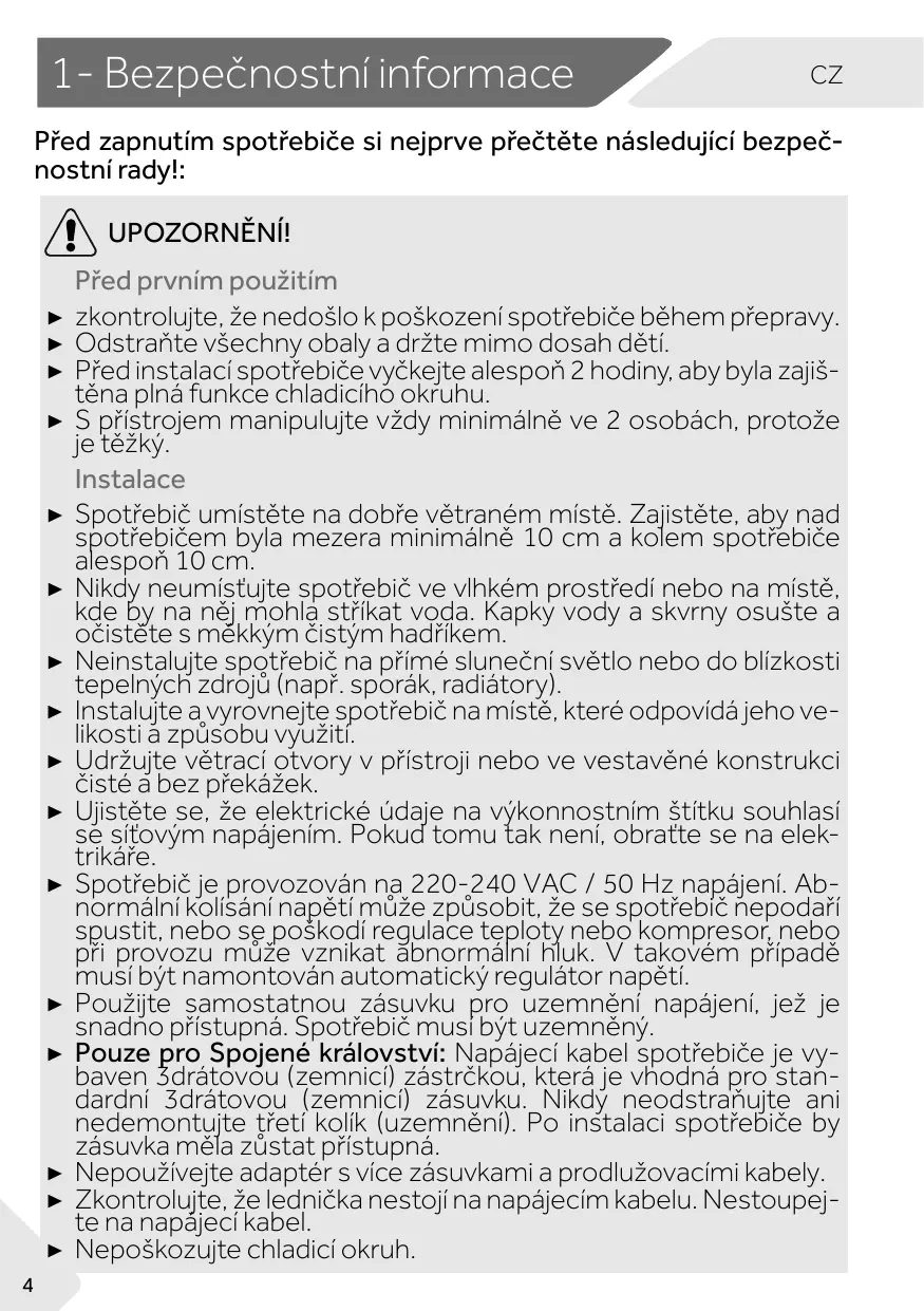 Risque de blessure ou d'asphyxie ! 2 O.K.-indi Les réfrigérants et les gaz doivent être mis au rebut par des professionnels. Avant toute mise au rebut, assurez-vous que la tuyauterie du système de réfrigération n'est pas tionnel) endommagée. Débranchez l'appareil du secteur. Coupez les câbles primaires et met3 Tiroir de tez-les au rebut. Retirez les plateaux et coffrets ainsi que le verrou de porte et les joints, rieure du pour éviter qu'un enfant ou un animal domestique ne reste coincé dans l'appareil. 4 Tiroir de rieure du 5 Pieds aju 6 Tiroir My Attendez au moins deux heures avant d'installer l'appareil pour une meilleure efficacité du système de réfrigération. Il faut toujours au moins deux personnes pour la manipulation de l’appareil car il est lourd. Installation Placez l'appareil dans un endroit bien ventilé. Laissez un espace d’au moins 10 cm au-dessus et 10 cm autour de l'appareil. Ne placez jamais l'appareil dans une zone ou à un endroit humide où il pourrait être éclaboussé par de l'eau. Nettoyez et séchez les éclaboussures d'eau et les tâches à l'aide d'un chiffon doux et propre. N'installez pas l'appareil en direction des rayons solaires ou à proximité des sources de chaleur (par exemple, les cuisinières, chauffe-eau). Installez et positionnez l'appareil dans un espace adéquat tenant compte de sa taille et son utilisation. Tenez les ouvertures d’aération de l'appareil ou dans les structures encastrées libres de toute obstruction. Vérifiez que les informations électriques sur la plaque signalétique sont conformes à l'alimentation électrique. Si ce n'est pas le cas, veuillez contacter un électricien. L'appareil fonctionne avec une alimentation à 220~240 VCA/50 Hz. Des fluctuations anormales de tension peuvent entraîner un échec de démarrage ou endommager le régulateur de température ou le compresseur, ou l'appareil peut émettre un bruit anormal pendant le fonctionnement. Dans de tels cas, installez un régulateur automatique. Pour l'alimentation électrique, utilisez une prise avec terre différente facilement accessible. Mettez à la terre cet appareil. Uniquement pour le Royaume-Uni: Cet appareil est équipé d’un cordon d’alimentation avec fiche à 3 fils (mise à la terre), répondant aux normes de la prise à 3 fils (mise à la terre). Ne coupez jamais ou ne démontez jamais le troisième fil (mise à la terre). Lorsque l’appareil est installé, la prise doit être accessible. N’utilisez pas d’adaptateurs multiprises ni de rallonges.