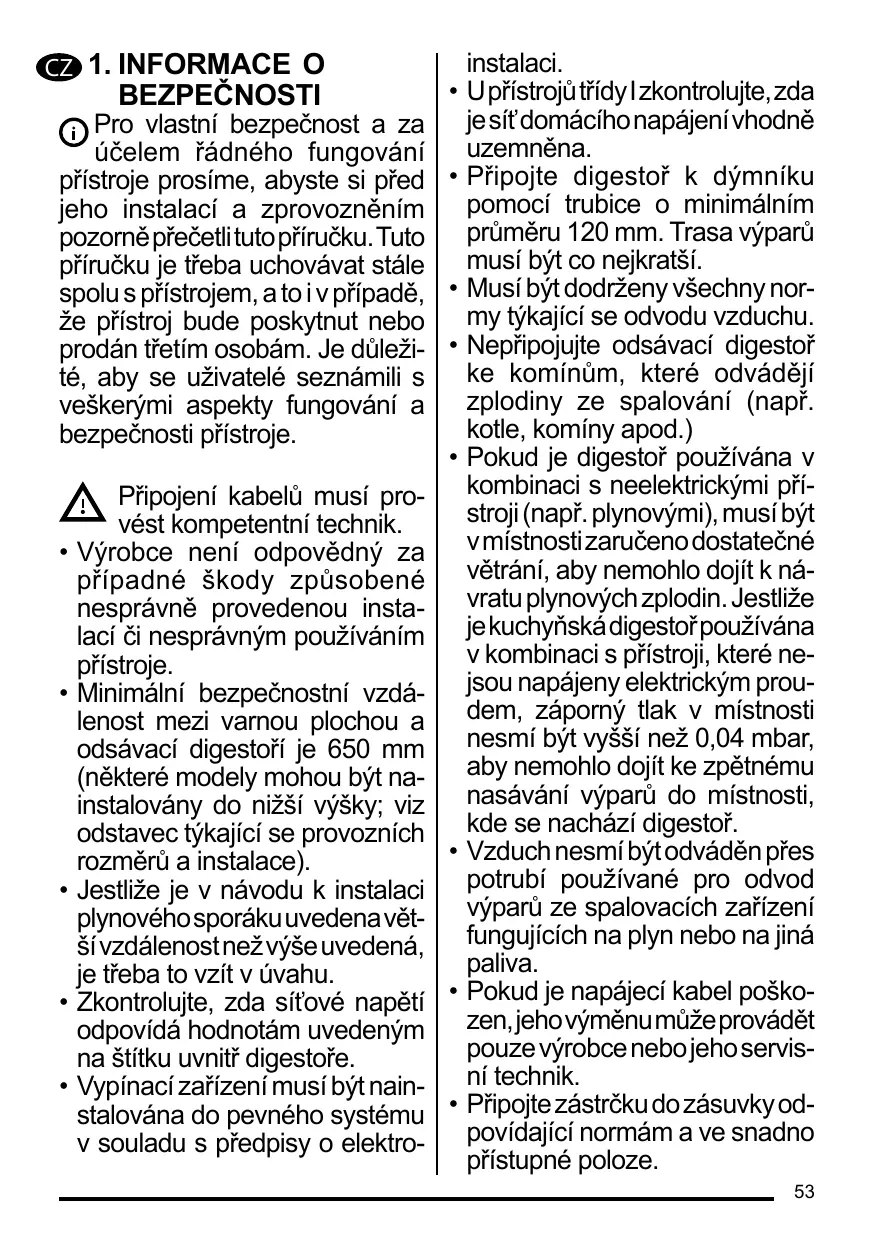 Pro vlastní bezpečnost a za účelem řádného fungování přístroje prosíme, abyste si před • jeho instalací a zprovozněním pozorně přečetli tuto příručku. Tuto příručku je třeba uchovávat stále spolu s přístrojem, a to i v případě, • že přístroj bude poskytnut nebo prodán třetím osobám. Je důleži- • té, aby se uživatelé seznámili s veškerými aspekty fungování a bezpečnosti přístroje. • Připojení kabelů musí provést kompetentní technik. • Výrobce není odpovědný za případné škody způsobené nesprávně provedenou instalací či nesprávným používáním přístroje. • Minimální bezpečnostní vzdálenost mezi varnou plochou a odsávací digestoří je 650 mm (některé modely mohou být nainstalovány do nižší výšky; viz odstavec týkající se provozních • rozměrů a instalace). • Jestliže je v návodu k instalaci plynového sporáku uvedena větší vzdálenost než výše uvedená, je třeba to vzít v úvahu. • Zkontrolujte, zda síťové napětí • odpovídá hodnotám uvedeným na štítku uvnitř digestoře. • Vypínací zařízení musí být nainstalována do pevného systému • v souladu s předpisy o elektro-
