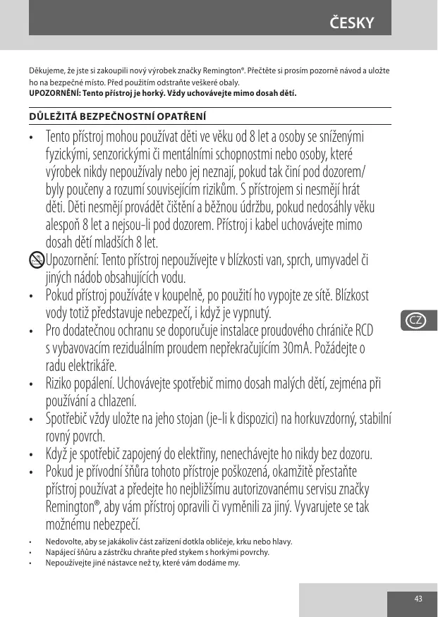 Tenez l’appareil et le câble hors de portée des enfants de moins de 8 ans. L Avertissement : Veillez à ne pas utiliser cet appareil à proximité de baignoires, douches, lavabos ou autres récipients contenant de l’eau. • Lorsque l’appareil est utilisé dans une salle de bains, débranchez-le après usage. La proximité de l’eau présente un danger même lorsque l’appareil est éteint. • Pour une protection supplémentaire, l’installation de courant résiduel (RCD)avec un differentiel residuel nominal ne dépassant pas 30mA est recommandée. Demandez de l’aide à un électricien. • Risque de brûlure. Veillez à maintenir l’appareil hors de portée des jeunes enfants, en particulier lorsque vous utilisez l’appareil et lorsqu’il refroidit. • Placez toujours l’appareil avec son support, le cas échéant, sur une surface plate, stable et résistante à la chaleur. • Ne laissez en aucun cas l’appareil sans surveillance quand il est connecté au réseau électrique. • Si le cordon d’alimentation de cet appareil est endommagé, cessez immédiatement d’utiliser l’appareil et renvoyez-le au service consommateurs Remington agréé le plus proche en vue de sa réparation ou de sa substitution afin d’éviter tout risque. 14