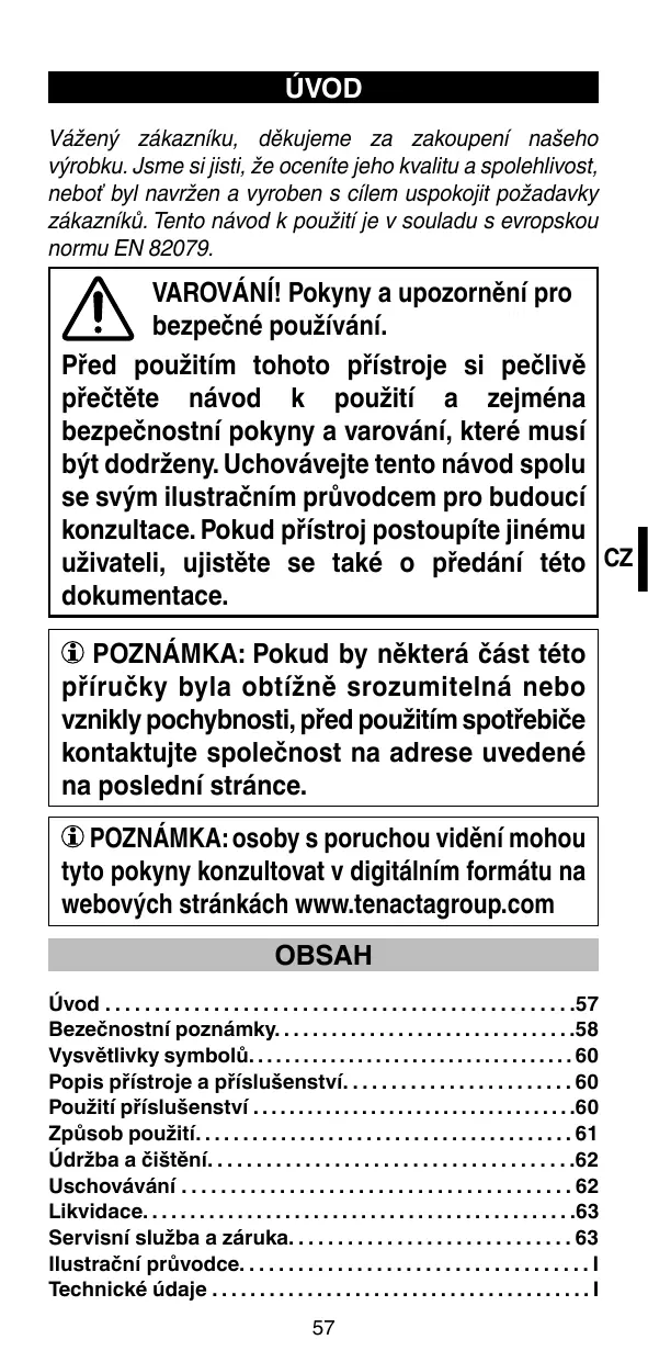 VAROVÁNÍ! Pokyny a upozornění pro bezpečné používání. Před použitím tohoto přístroje si pečlivě přečtěte návod k použití a zejména bezpečnostní pokyny a varování, které musí být dodrženy. Uchovávejte tento návod spolu se svým ilustračním průvodcem pro budoucí konzultace. Pokud přístroj postoupíte jinému uživateli, ujistěte se také o předání této CZ dokumentace. POZNÁMKA: Pokud by některá část této příručky byla obtížně srozumitelná nebo vznikly pochybnosti, před použitím spotřebiče kontaktujte společnost na adrese uvedené na poslední stránce. POZNÁMKA: osoby s poruchou vidění mohou tyto pokyny konzultovat v digitálním formátu na webových stránkách www.tenactagroup.com OBSAH