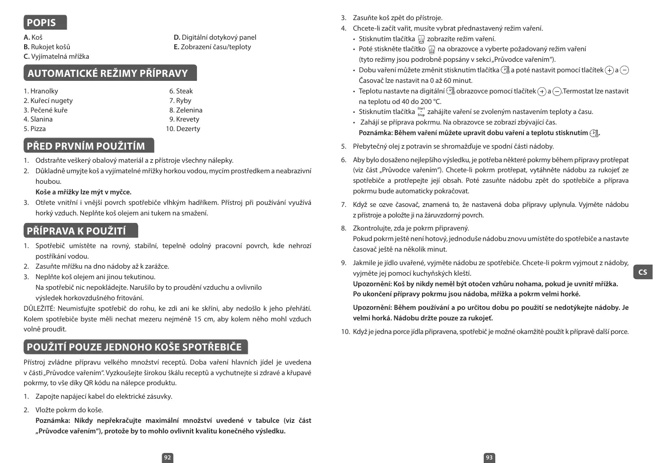 à une meilleure homogénéité de la cuisson des ingrédients Ajoutez de l’huile aux pommes de terre fraîches pour obtenir un résultat croustillant et secouez-les pour les couvrir uniformément. Nous recommandons 14 ml d’huile. Les bouchées qui peuvent être cuites au four peuvent également être cuites dans l’appareil. La quantité optimale de frites pour obtenir un résultat croustillant est de 700 grammes. Utilisez de la pâte toute prête pour préparer des bouchées fourrées rapidement et