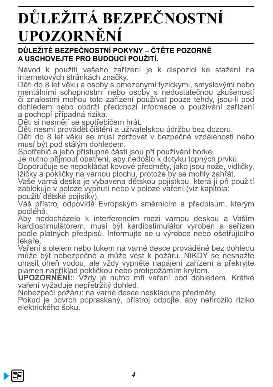 Réglage de la puissance12 Horizone ou duozone 12 Réglage de la minuterie12 Minuteur indépendant 13 Touche ELAPSED TIME13 Verrouillage des commandes 13 Fonction ICS14 Cet appareil peut être utilisé par des enfants âgés de 8 ans et plus et par des personnes ayant des capacités physiques, sensorielles ou mentales réduites ou des personnes sans expérience et connaissance, si elles ont été correctement informées ou formées à l’utilisation de l’appareil en toute sécurité et qu’elles en comprennent les risques qui en résultent. Les enfants ne doivent pas jouer avec l’appareil. Le nettoyage et l’entretien par l’usager ne doivent pas être effectués par des enfants sans surveillance. Les enfants de moins de 8 ans doivent être tenus à l’écart à moins qu’ils ne soient surveillés en permanence. L’appareil et ses parties accessibles deviennent chauds pendant l’utilisation. Des précautions doivent être prises pour éviter de toucher les éléments chauffants. Les objets métalliques tels que couteaux, fourchettes, cuillères et couvercles ne doivent pas être placés sur la surface, car ils peuvent devenir chauds. Votre table possède une sécurité enfant qui verrouille son utilisation à l’arrêt ou en cours de cuisson (voir chapitre: utilisation de la sécurité enfant). Votre appareil est conforme aux directives et réglementations européennes auxquelles il est soumis. Afin qu’il n’y ait pas d’interférences entre votre table de cuisson et un stimulateur cardiaque, ce dernier doit être conçu et réglé en conformité avec la réglementation qui le concerne. Renseignez vous auprès de son fabricant ou votre médecin traitant. Une cuisson avec de l’huile ou de la matière grasse effectuée sur une table, et sans surveillance peut être dangereuse et donner lieu à un incendie. Ne tentez JAMAIS d’éteindre un feu avec de l’eau, mais coupez l’alimentation de l’appareil avant de couvrir la flamme avec par exemple un couvercle ou une couverture anti feu. ATTENTION : la cuisson doit être surveillée. Une cuisson courte nécessite une surveillance continue. Risque d’incendie : ne pas stocker d’objets sur les zones de cuisson. Si la surface est fissurée, déconnecter l’appareil pour éviter le risque de choc électrique. 4