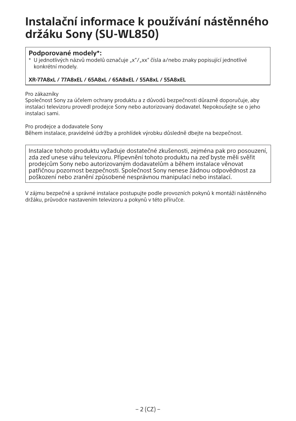HU Instalační informace k používání nástěnného držáku Sony (SU-WL850) Podporované modely*: * U jednotlivých názvů modelů označuje „x“/„xx“ čísla a/nebo znaky popisující jednotlivé konkrétní modely. XR-77A8xL / 77A8xEL / 65A8xL / 65A8xEL / 55A8xL / 55A8xEL Pro zákazníky Společnost Sony za účelem ochrany produktu a z důvodů bezpečnosti důrazně doporučuje, aby instalaci televizoru provedl prodejce Sony nebo autorizovaný dodavatel. Nepokoušejte se o jeho instalaci sami. Pro prodejce a dodavatele Sony Během instalace, pravidelné údržby a prohlídek výrobku důsledně dbejte na bezpečnost.