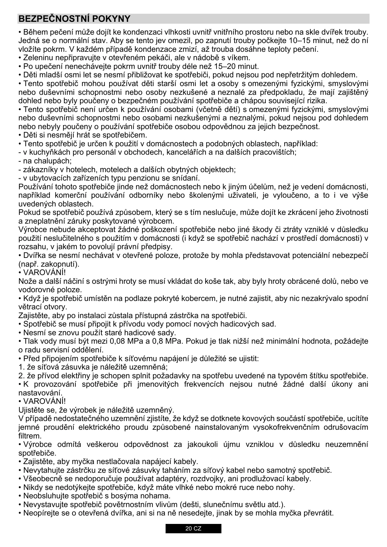 19 GB BEZPEČNOSTNÍ POKYNY • Během pečení může dojít ke kondenzaci vlhkosti uvnitř vnitřního prostoru nebo na skle dvířek trouby. Jedná se o normální stav. Aby se tento jev omezil, po zapnutí trouby počkejte 10–15 minut, než do ní vložíte pokrm. V každém případě kondenzace zmizí, až trouba dosáhne teploty pečení. • Zeleninu nepřipravujte v otevřeném pekáči, ale v nádobě s víkem. • Po upečení nenechávejte pokrm uvnitř trouby déle než 15–20 minut. • Děti mladší osmi let se nesmí přibližovat ke spotřebiči, pokud nejsou pod nepřetržitým dohledem. • Tento spotřebič mohou používat děti starší osmi let a osoby s omezenými fyzickými, smyslovými nebo duševními schopnostmi nebo osoby nezkušené a neznalé za předpokladu, že mají zajištěný dohled nebo byly poučeny o bezpečném používání spotřebiče a chápou související rizika. • Tento spotřebič není určen k používání osobami (včetně dětí) s omezenými fyzickými, smyslovými nebo duševními schopnostmi nebo osobami nezkušenými a neznalými, pokud nejsou pod dohledem nebo nebyly poučeny o používání spotřebiče osobou odpovědnou za jejich bezpečnost. • Děti si nesmějí hrát se spotřebičem. • Tento spotřebič je určen k použití v domácnostech a podobných oblastech, například: - v kuchyňkách pro personál v obchodech, kancelářích a na dalších pracovištích; - na chalupách; - zákazníky v hotelech, motelech a dalších obytných objektech; - v ubytovacích zařízeních typu penzionu se snídaní. Používání tohoto spotřebiče jinde než domácnostech nebo k jiným účelům, než je vedení domácnosti, například komerční používání odborníky nebo školenými uživateli, je vyloučeno, a to i ve výše uvedených oblastech. Pokud se spotřebič používá způsobem, který se s tím neslučuje, může dojít ke zkrácení jeho životnosti a zneplatnění záruky poskytované výrobcem. Výrobce nebude akceptovat žádné poškození spotřebiče nebo jiné škody či ztráty vzniklé v důsledku použití neslučitelného s použitím v domácnosti (i když se spotřebič nachází v prostředí domácnosti) v rozsahu, v jakém to povolují právní předpisy. • Dvířka se nesmí nechávat v otevřené poloze, protože by mohla představovat potenciální nebezpečí (např. zakopnutí). • VAROVÁNÍ! Nože a další náčiní s ostrými hroty se musí vkládat do koše tak, aby byly hroty obrácené dolů, nebo ve vodorovné poloze. • Když je spotřebič umístěn na podlaze pokryté kobercem, je nutné zajistit, aby nic nezakrývalo spodní větrací otvory. Zajistěte, aby po instalaci zůstala přístupná zástrčka na spotřebiči. • Spotřebič se musí připojit k přívodu vody pomocí nových hadicových sad. • Nesmí se znovu použít staré hadicové sady. • Tlak vody musí být mezi 0,08 MPa a 0,8 MPa. Pokud je tlak nižší než minimální hodnota, požádejte o radu servisní oddělení. • Před připojením spotřebiče k síťovému napájení je důležité se ujistit: 1. že síťová zásuvka je náležitě uzemněná; 2. že přívod elektřiny je schopen splnit požadavky na spotřebu uvedené na typovém štítku spotřebiče. • K provozování spotřebiče při jmenovitých frekvencích nejsou nutné žádné další úkony ani nastavování. • VAROVÁNÍ! Ujistěte se, že výrobek je náležitě uzemněný. V případě nedostatečného uzemnění zjistíte, že když se dotknete kovových součástí spotřebiče, ucítíte jemné proudění elektrického proudu způsobené nainstalovaným vysokofrekvenčním odrušovacím filtrem. • Výrobce odmítá veškerou odpovědnost za jakoukoli újmu vzniklou v důsledku neuzemnění spotřebiče. • Zajistěte, aby myčka nestlačovala napájecí kabely. • Nevytahujte zástrčku ze síťové zásuvky taháním za síťový kabel nebo samotný spotřebič. • Všeobecně se nedoporučuje používat adaptéry, rozdvojky, ani prodlužovací kabely. • Nikdy se nedotýkejte spotřebiče, když máte vlhké nebo mokré ruce nebo nohy. • Neobsluhujte spotřebič s bosýma nohama. • Nevystavujte spotřebič povětrnostním vlivům (dešti, slunečnímu světlu atd.). • Neopírejte se o otevřená dvířka, ani si na ně nesedejte, jinak by se mohla myčka převrátit.