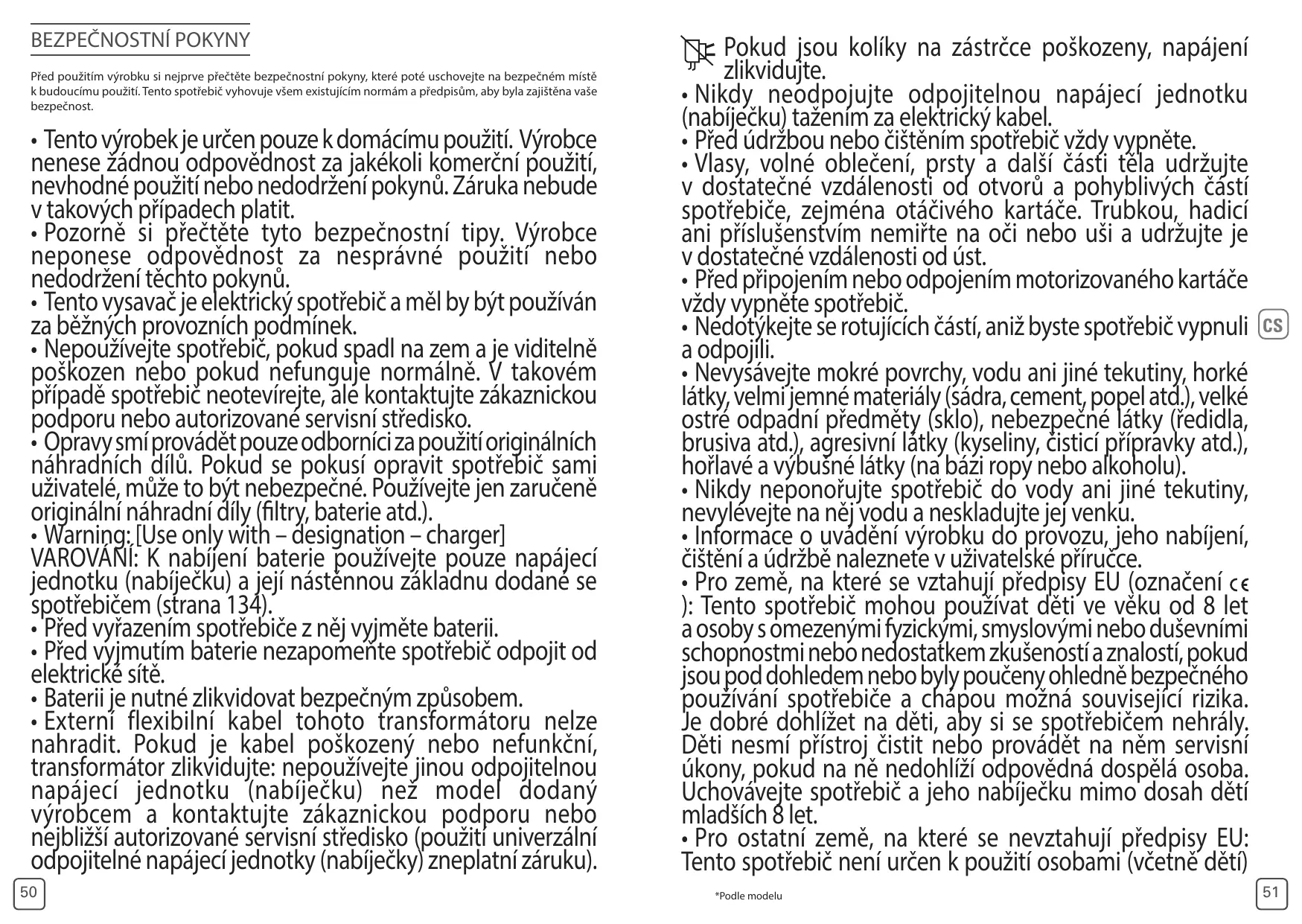 • Lisez attentivement ces conseils de sécurité. Une utilisation non appropriée ou non conforme au mode d’emploi dégagerait la marque de toute responsabilité. • Votre aspirateur est un appareil électrique : il doit être utilisé dans des conditions normales d’utilisation. • Ne pas utiliser l’appareil s’il est tombé et présente des détériorations visibles ou des anomalies de fonctionnement. Dans ce cas ne pas ouvrir l’appareil, mais l’envoyer au Centre Services agréés le plus proche de votre domicile, car des outils spéciaux sont nécessaires pour effectuer toute réparation afin d’éviter un danger. • Les réparations ne doivent être effectuées que par des spécialistes avec des pièces détachées d’origine : réparer un appareil soi-même peut constituer un danger pour l’utilisateur. N’utiliser que des accessoires garantis d’origine (filtres, batteries...). • Warning: [Use only with – designation – charger] MISE EN GARDE : Pour le rechargement de la batterie, utiliser uniquement l’unité d’alimentation amovible (chargeur) et sa fixation murale fournies avec l’appareil (page 134). • La batterie doit être retirée de l’appareil avant que celui-ci ne soit mis au rebus. • L’appareil doit être déconnecté du réseau d’alimentation lorsqu’on retire la batterie. • La batterie doit être éliminée de façon sûre. • Le câble ou le cordon flexible externe de ce transformateur ne peut être remplacé; si le cordon est endommagé ou ne fonctionne pas, le transformateur doit être mis au rebut : n’utilisez pas de bloc d’alimentation amovible (chargeur) autre que le modèle fourni par le fabricant et contactez le service clientèle ou votre centre de service agréé le plus proche (utilisation d’un bloc d’alimentation amovible universel ( chargeur) annule la garantie) 2