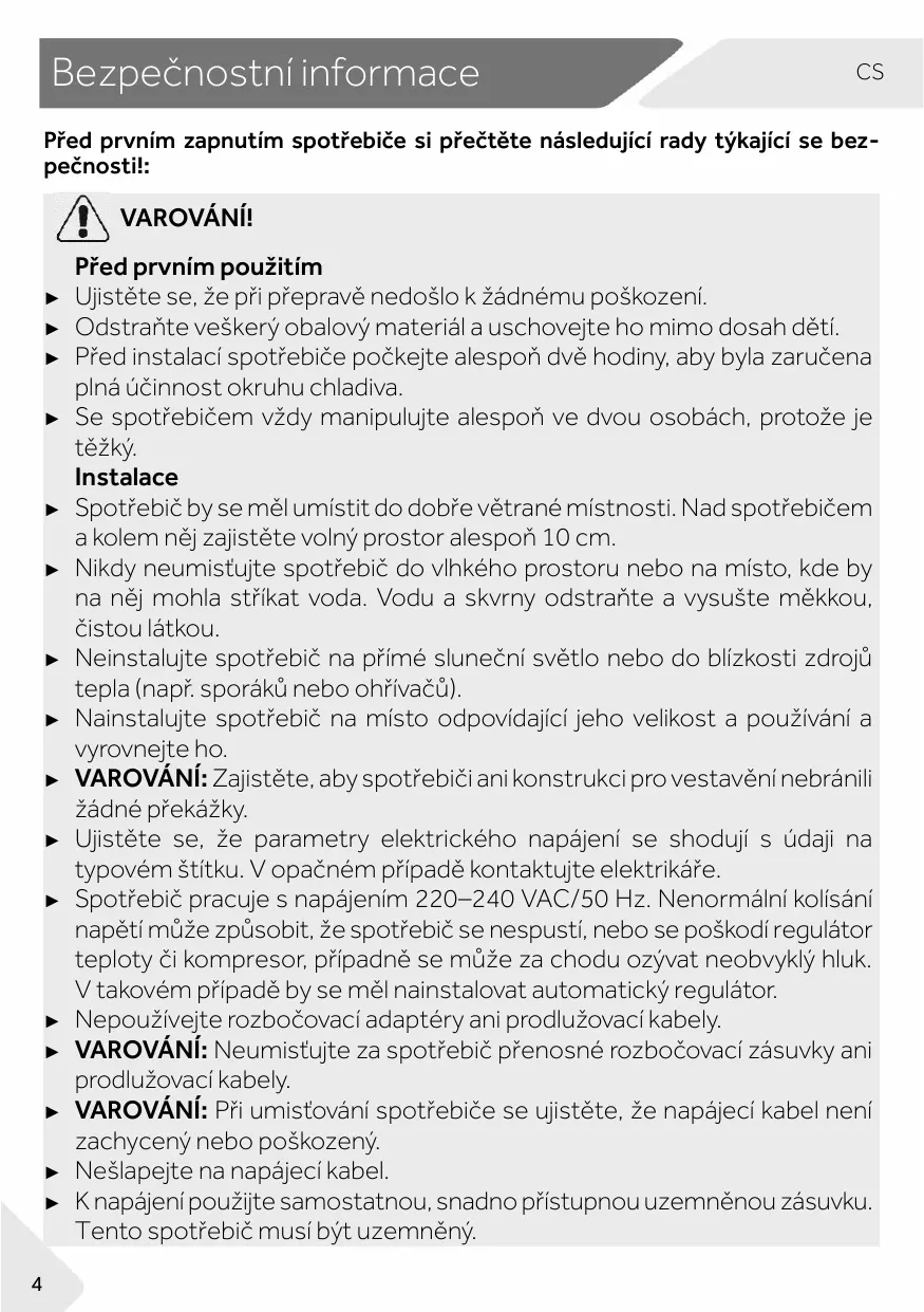 être éclaboussé d'eau. Nettoyez et séchez les éclaboussures d'eau et les taches avec un chiffon doux et propre. ► N’installez pas l'appareil en plein soleil ou à proximité de sources de chaleur (par ex. cuisinières, chauffages). ► Installez et mettez à niveau l'appareil dans une zone adaptée à sa taille et à son utilisation. ► AVERTISSEMENT : maintenez les ouvertures de ventilation situées dans l'appareil ou dans la structure encastrée libres de toute obstruction. ► Assurez-vous que les informations électriques figurant sur la plaque signalétique sont conformes à l'alimentation électrique. Si ce n'est pas le cas, contactez un électricien. ► L'appareil est alimenté par une alimentation de 220-240 VCA/50 Hz. Les variations anormales de tension peuvent provoquer l'arrêt de l'appareil ou endommager le régulateur de température ou le compresseur, ou il peut y avoir un bruit anormal lors du fonctionnement. Dans ce cas, un régulateur automatique doit être monté. ► N'utilisez pas d'adaptateurs multiprises ni de rallonges. ► AVERTISSEMENT : ne placez pas des systèmes multiprises portatifs ou des alimentations portatives à l’arrière de l’appareil. ► AVERTISSEMENT : lors du positionnement de l’appareil, vérifiez que le cordon d’alimentation n’est pas coincé ou abîmé. ► Ne marchez pas sur le câble d'alimentation. ► Utilisez une prise de terre séparée pour l'alimentation électrique qui est facile d'accès. L'appareil doit être mis à la terre.