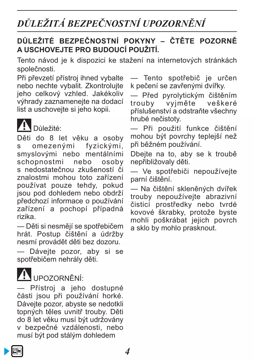 — Cet appareil est conçu pour faire des cuissons porte fermée. Important : Cet appareil peut être utilisé par — Avant de procéder à un nettoyage des enfants âgés de 8 ans et pyrolyse de votre four, retirez tous plus, et par des personnes aux les accessoires et enlevez les capacités physiques, sensorielles éclaboussures importantes. ou mentales réduites, ou dénuées — Dans la fonction de nettoyage, d’expérience et de connaissance, les surfaces peuvent devenir plus si elles ont pu bénéficier d’une chaudes qu’en usage normal. surveillance ou d’instructions Il est recommandé d’éloigner les préalables concernant l’utilisation enfants. de l’appareil de façon sûre et en ont — Ne pas utiliser d’appareil de compris les risques encourus. nettoyage à la vapeur. — Les enfants ne doivent pas jouer — Ne pas utiliser de produits avec l’appareil. Les opérations de d’entretien abrasifs ou de grattoirs nettoyage et de maintenance ne métalliques durs pour nettoyer doivent pas être faites par des la porte en verre du four, ce enfants laissés sans surveillance. qui pourrait érafler la surface et — Il convient de surveiller les entraîner l’éclatement du verre. enfants pour s’assurer qu’ils ne jouent pas avec l’appareil. MISE EN GARDE : — L’appareil et ses parties accessibles deviennent chaudes au