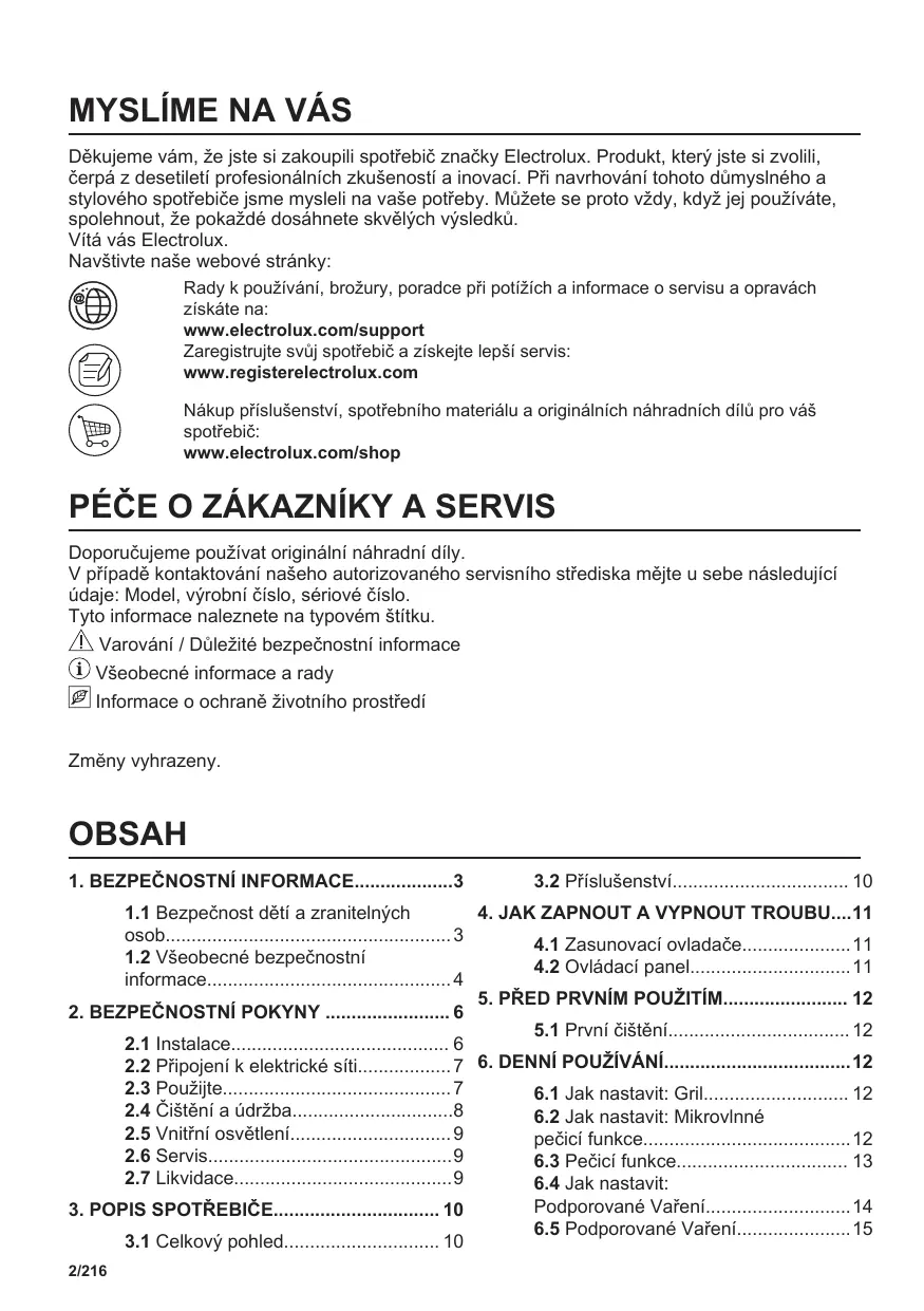 Děkujeme vám, že jste si zakoupili spotřebič značky Electrolux. Produkt, který jste si zvolili, čerpá z desetiletí profesionálních zkušeností a inovací. Při navrhování tohoto důmyslného a stylového spotřebiče jsme mysleli na vaše potřeby. Můžete se proto vždy, když jej používáte, spolehnout, že pokaždé dosáhnete skvělých výsledků. Vítá vás Electrolux. Navštivte naše webové stránky: Rady k používání, brožury, poradce při potížích a informace o servisu a opravách získáte na: www.electrolux.com/support Zaregistrujte svůj spotřebič a získejte lepší servis: www.registerelectrolux.com Nákup příslušenství, spotřebního materiálu a originálních náhradních dílů pro váš spotřebič: www.electrolux.com/shop PÉČE O ZÁKAZNÍKY A SERVIS Doporučujeme používat originální náhradní díly. V případě kontaktování našeho autorizovaného servisního střediska mějte u sebe následující údaje: Model, výrobní číslo, sériové číslo. Tyto informace naleznete na typovém štítku. Varování / Důležité bezpečnostní informace Všeobecné informace a rady Informace o ochraně životního prostředí Zmĕny vyhrazeny. OBSAH