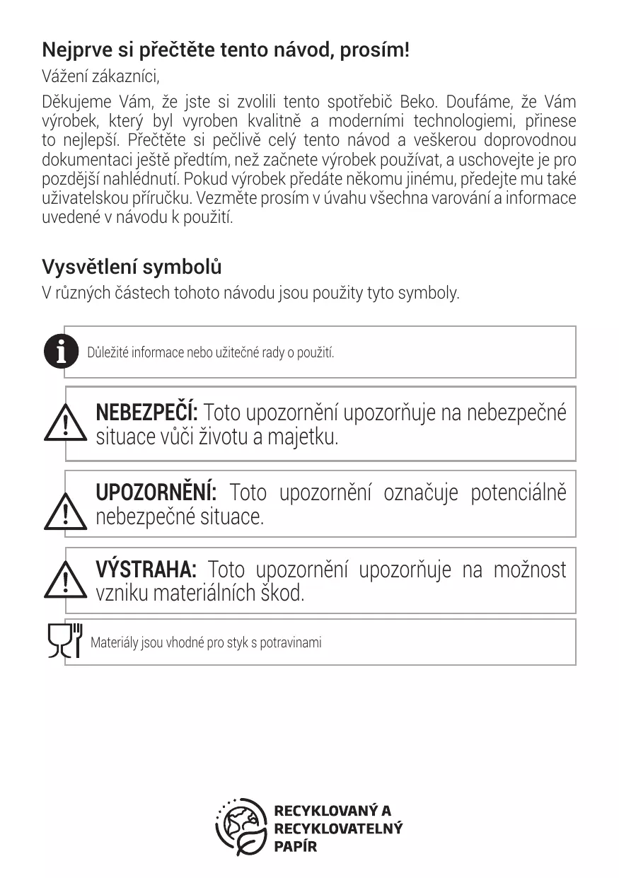 AVERTISSEMENT : Cet avertissement indique des situations potentiellement dangereuses. ATTENTION : Cet avertissement indique le risque de dommages matériels. Les matériaux sont adaptés au contact alimentaire
