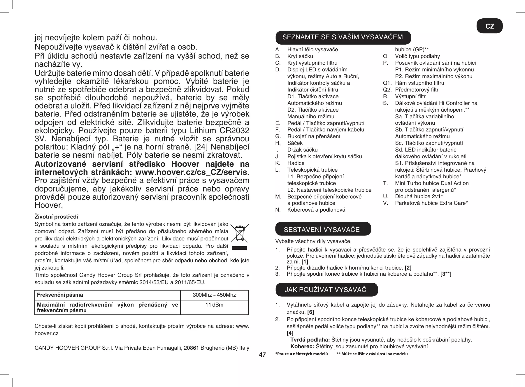 jej neovíjejte kolem paží či nohou. Nepoužívejte vysavač k čištění zvířat a osob. Při úklidu schodů nestavte zařízení na vyšší schod, než se nacházíte vy. Udržujte baterie mimo dosah dětí. V případě spolknutí baterie vyhledejte okamžitě lékařskou pomoc. Vybité baterie je nutné ze spotřebiče odebrat a bezpečně zlikvidovat. Pokud se spotřebič dlouhodobě nepoužívá, baterie by se měly odebrat a uložit. Před likvidací zařízení z něj nejprve vyjměte baterie. Před odstraněním baterie se ujistěte, že je výrobek odpojen od elektrické sítě. Zlikvidujte baterie bezpečně a ekologicky. Používejte pouze baterii typu Lithium CR2032 3V. Nenabíjecí typ. Baterie je nutné vložit se správnou polaritou: Kladný pól „+“ je na horní straně. [24] Nenabíjecí baterie se nesmí nabíjet. Póly baterie se nesmí zkratovat. Autorizované servisní středisko Hoover najdete na internetových stránkách: www.hoover.cz/cs_CZ/servis. Pro zajištění vždy bezpečné a efektivní práce s vysavačem doporučujeme, aby jakékoliv servisní práce nebo opravy prováděl pouze autorizovaný servisní pracovník společnosti Hoover.