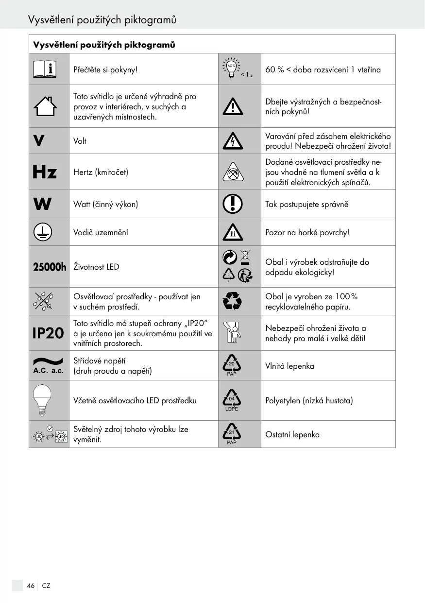 Použití ke stanovenému účelu Toto svítidlo je určené výhradně pro provoz v interiéru, v suchých a uzavřených místnostech. Svítidlo lze upevnit na všechny běžně hořlavé povrchy. Tento přístroj je určen pouze k použití v domácnosti. Tento výrobek je určen pouze k běžnému používání.
