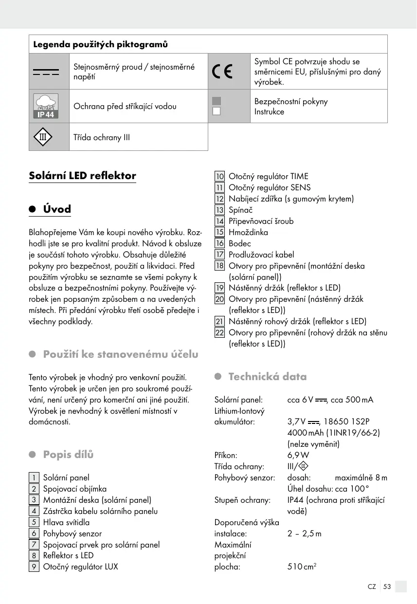 Třída ochrany III Solární LED reflektor Úvod Blahopřejeme Vám ke koupi nového výrobku. Rozhodli jste se pro kvalitní produkt. Návod k obsluze je součástí tohoto výrobku. Obsahuje důležité pokyny pro bezpečnost, použití a likvidaci. Před použitím výrobku se seznamte se všemi pokyny k obsluze a bezpečnostními pokyny. Používejte výrobek jen popsaným způsobem a na uvedených místech. Při předání výrobku třetí osobě předejte i všechny podklady.