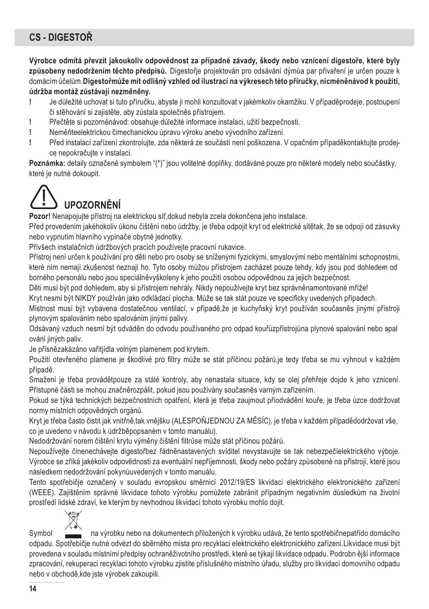 UPOZORNĚNÍ Pozor! Nenapojujte přístroj na elektrickou síť,dokud nebyla zcela dokončena jeho instalace. Před provedením jakéhokoliv úkonu čištění nebo údržby, je třeba odpojit kryt od elektrické sítětak, že se odpojí od zásuvky nebo vypnutím hlavního vypínače obytné jednotky. Přivšech instalačních údržbových pracích používejte pracovní rukavice. Přístroj není určen k používání pro děti nebo pro osoby se sníženými fyzickými, smyslovými nebo mentálními schopnostmi, které ním nemají zkušenost neznají ho. Tyto osoby můžou přístrojem zacházet pouze tehdy, kdy jsou pod dohledem - od borného personálu nebo jsou speciálněvyškoleny k jeho použití osobou odpovědnou za jejich bezpečnost. Děti musí být pod dohledem, aby si přístrojem nehrály. Nikdy nepoužívejte kryt bez správněnamontované mříže! Kryt nesmí být NIKDY používán jako odkládací plocha. Může se tak stát pouze ve specificky uvedených případech. Místnost musí být vybavena dostatečnou ventilací, v případě,že je kuchyňský kryt používán současněs jinými přístroji plynovým spalováním nebo spalováním jinými palivy. Odsávaný vzduch nesmí být odváděn do odvodu používaného pro odpad kouřůzpřístrojůna plynové spalování nebo s-pal ování jiných paliv. Je přísnězakázáno vařitjídla volným plamenem pod krytem. Použití otevřeného plamene je škodlivé pro filtry může se stát příčinou požárů,je tedy třeba se mu vyhnout v každém případě. Smažení je třeba provádětpouze za stálé kontroly, aby nenastala situace, kdy se olej přehřeje dojde k jeho vznícení. Přístupné části se mohou značněrozpálit, pokud jsou používány současněs varným zařízením. Pokud se týká technických bezpečnostních opatření, která je třeba zaujmout přiodvádění kouře, je třeba úzce dodržovat normy místních odpovědných orgánů. Kryt je třeba často čistit jak vnitřně,tak vnějšku (ALESPOŇJEDNOU ZA MĚSÍC), je třeba v každém případědodržovat vše, co je uvedeno v návodu k údržběpopsaném v tomto manuálu). Nedodržování norem čištění krytu výměny čištění filtrůse může stát příčinou požárů. Nepoužívejte činenechávejte digestořbez řádněnastavených svíditel nevystavujte se tak nebezpečíelektrického výboje. Výrobce se zříká jakékoliv odpovědnosti za eventuální nepříjemnosti, škody nebo požáry způsobené na přístroji, které jsou následkem nedodržování pokynůuvedených v tomto manuálu. Tento spotřebičje označený v souladu evropskou směrnicí 2012/19/ES likvidaci elektrického elektronického zařízení (WEEE). Zajištěním správné likvidace tohoto výrobku pomůžete zabránit případným negativním důsledkům na životní prostředí lidské zdraví, ke kterým by nevhodnou likvidací tohoto výrobku mohlo dojít.