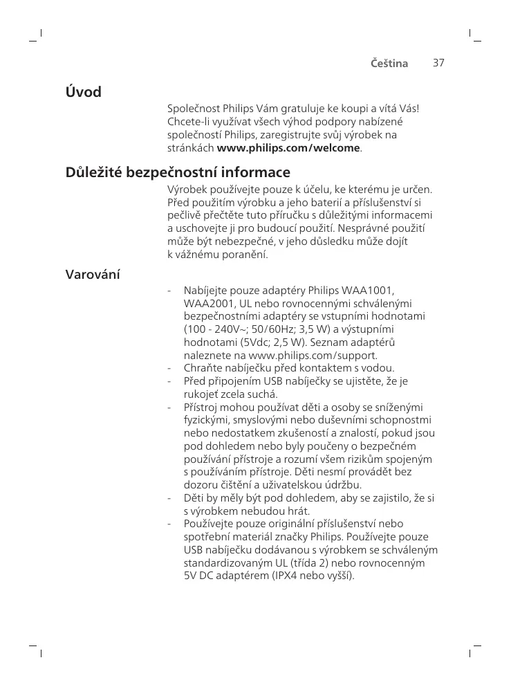 - Utilisez exclusivement des accessoires ou des consommables de la marque Philips. Utilisez uniquement le chargeur USB fourni avec le produit avec un adaptateur SV CC (IPX4 ou supérieur) homologué UL (classe 2) ou équivalent.