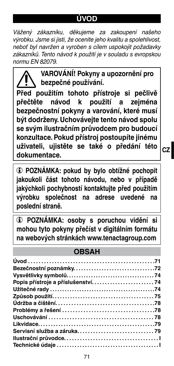 ® POZNAMKA: osoby s poruchou vidéni si mohou tyto pokyny preëist v digitälnim formätu na webovÿch stränkäch www.tenactagroup.com