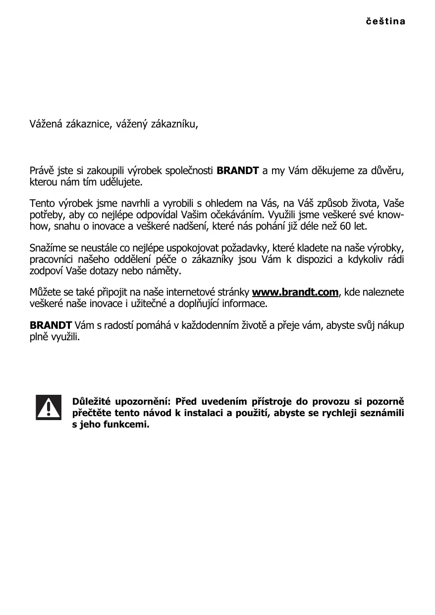 Véïené zäkaznice, väzenÿ zkazniku, Prévé jste si zakoupili vyrobek spoleénosti BRANDT a my Väm dékujeme za düvêru, kterou nâm tim udélujete. Tento vÿrobek jsme navrhli a vyrobili s ohledem na Vés, na Véë zpüsob äivota, Vase potieby, aby co nejlépe odpovidal Vaëim oéekévénim. Vyuäilijsme veëkeré své knowhow, snahu o inovace a veëkeré nadéeni, které ns pohéni jiz déle nez 60 let. Snazime se neustéle co nejlépe uspokojovat pozadavky, které Kladete na naëe vÿrobky, pracovnici naëeho oddëleni péèe o zékazniky sou Väm k dispozici a kdykoliv rédi zodpovi Vase dotazy nebo némëty. Müzete navétivit také naëe internetové strénky www.brandt.ez, kde naleznete nejen veëkeré naëe novinky, ale imnoho uziteënÿch dopläujfcich informaci. BRANDT Vém s radosti poméhé v kaëdodennim äivoté a preje Vâm maximéini spokojenost s timto novÿm spotiebiéem. Dülezité upozornënf: Pred uvedenim spotrebiée do provozu si pozorné preëtéte tento névod kobsluze a instalaci, abyste se rychleji seznämili s jeho funkcemi.