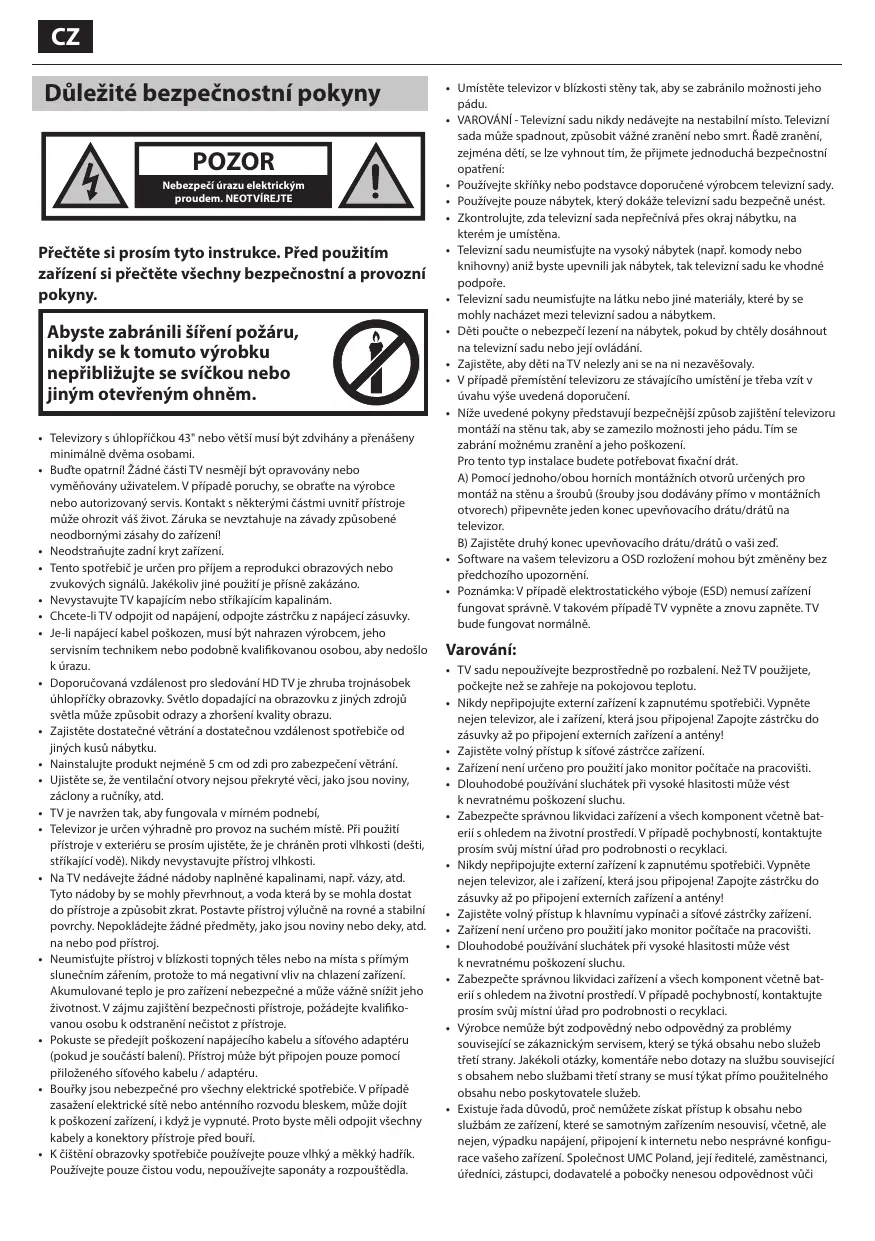 + Cette TV ne contient aucune pièce qui pourrait être réparée par l'utilisateur. En cas de défaut, contacter le fabricant ou l'agent autorisé qui assure le service après-vente. Le contact avec certaines parties situ- es à l'intérieur de la TV pourrait mettre votre vie en danger. La garantie ne couvre pas les défauts provoqués par des réparations effectuées par des tiers non autorisés.